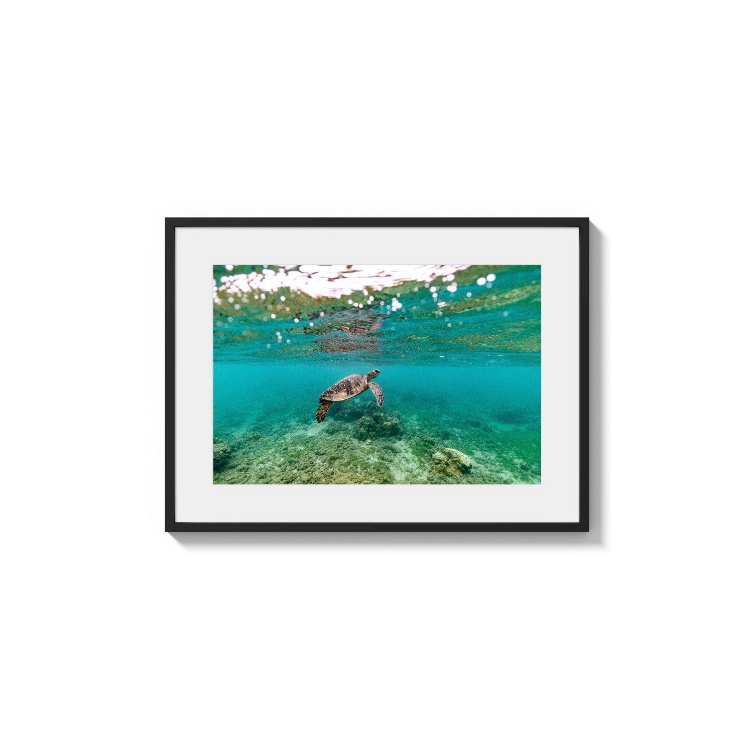 Keywords: Oceanic creature, wildlife, tropical, swimming, turtle shell, submersed, underwater, snorkeling, diving, clear water, surface split, habitat, teal coloration, coral reef, nature photography, reptile, depths