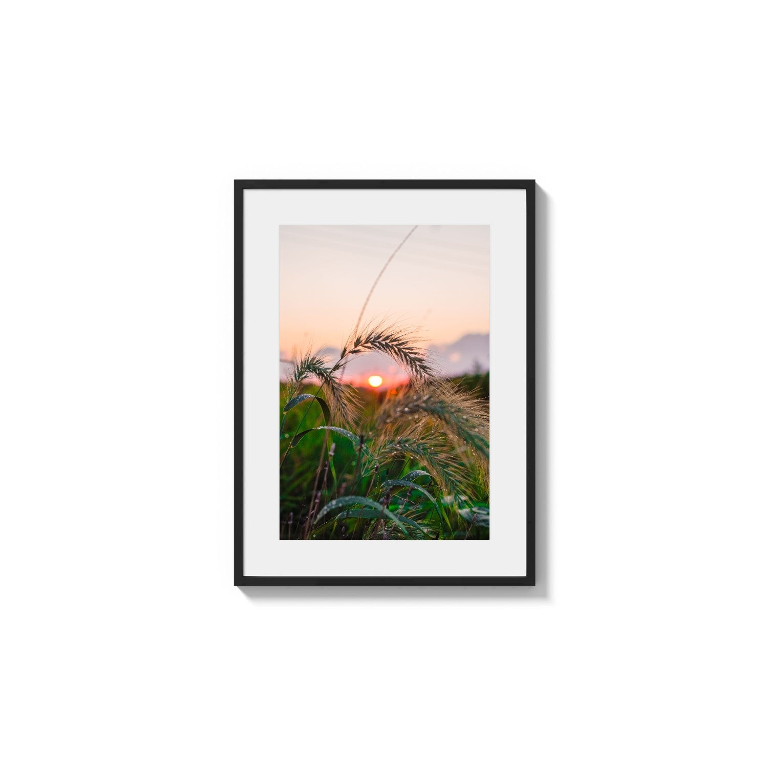 A photograph captures the delicate structure of cereal grains rising against an ethereal sky. The sun, a disc of burnt orange, peeks through the textured seed heads, backlighting the entire scene. Foreground foliage is a saturated green, heavily detailed with sparkling droplets of condensation. The upper atmosphere blends soft peach and pale lavender tones, creating a tranquil, refreshing atmosphere typical of early morning.