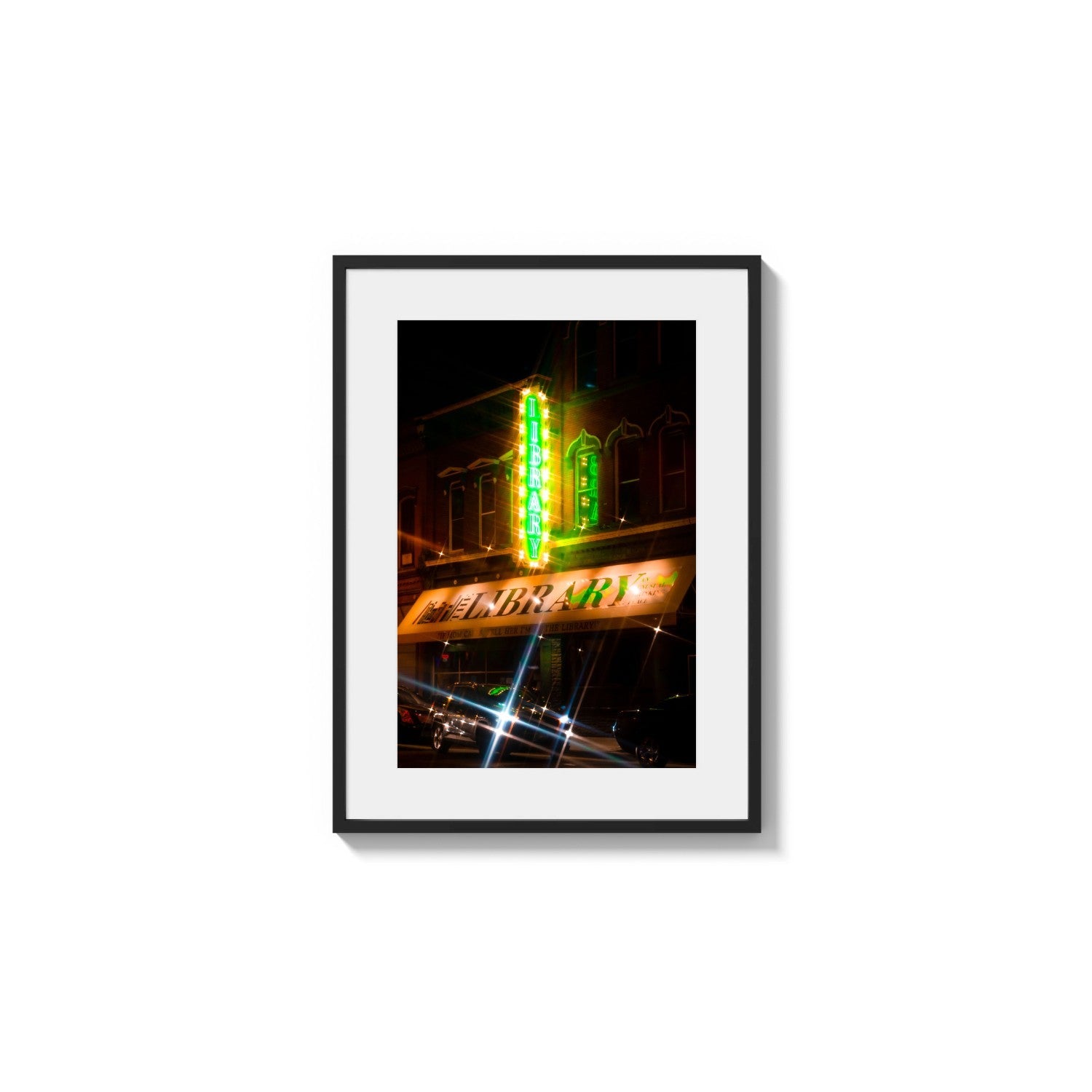 This photograph captures a dramatic urban scene dominated by bright neon illumination against a deep black background. Brilliant electric green light radiates from a tall vertical sign, contrasting with the yellow and green signage placed above an awning that reads "LIBRARY." The darkness of the surrounding building architecture enhances the stark contrast of the vibrant colors. Streaks and starburst effects from automobile headlights in the foreground emphasize the metropolitan nightlife and retro aesthetic.