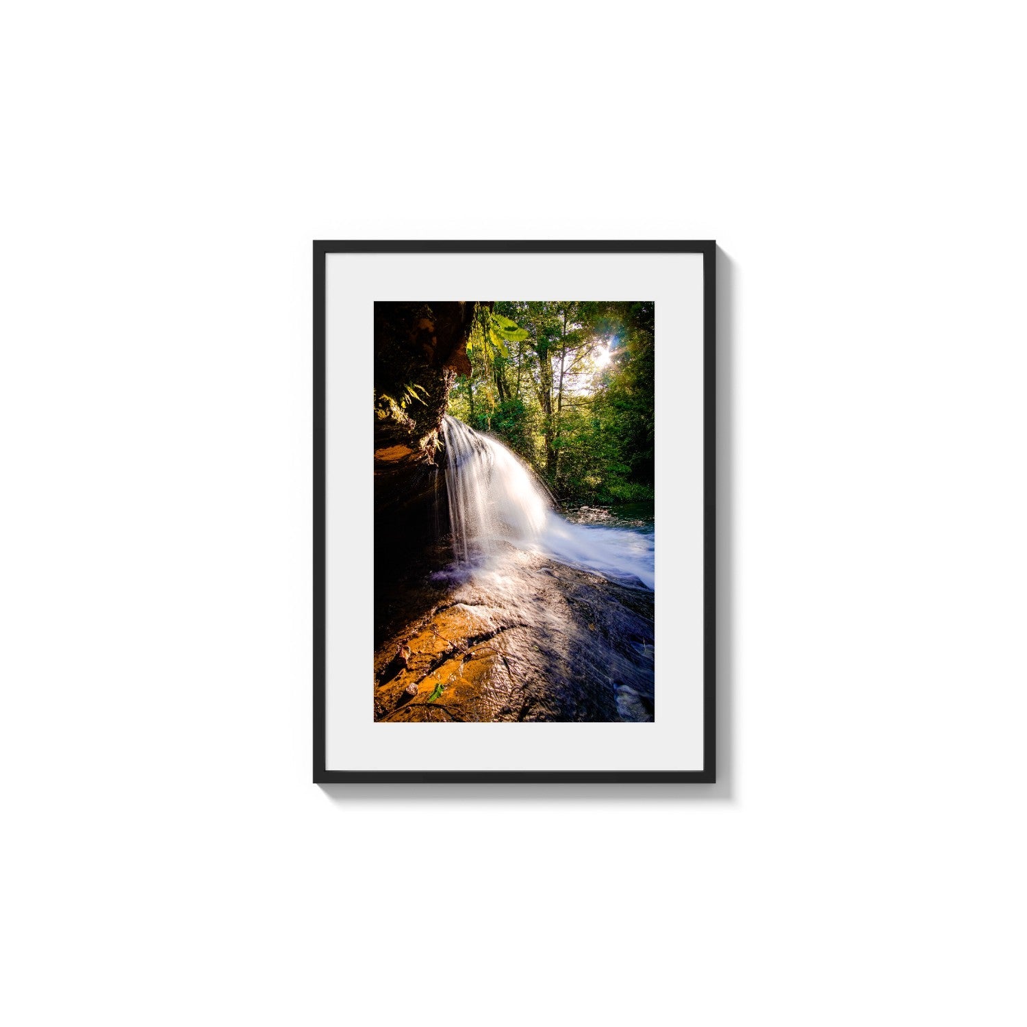 Keywords: Waterfall, cascade, nature photography, forest, sunburst, flowing water, landscape, dramatic light, long exposure, outdoor scene.