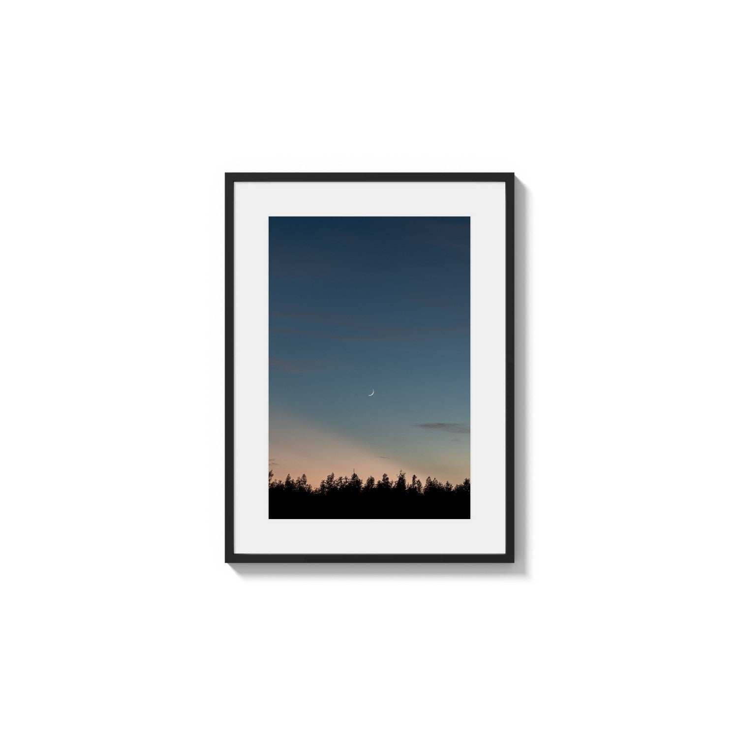 Keywords: twilight, crescent moon, forest silhouette, minimalist landscape, blue and peach sky, atmospheric photography, dusk, celestial.