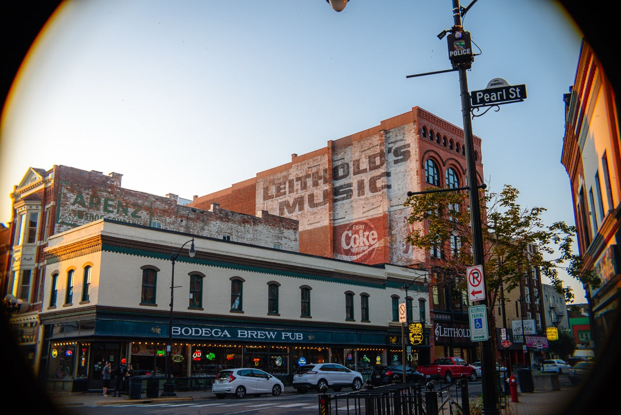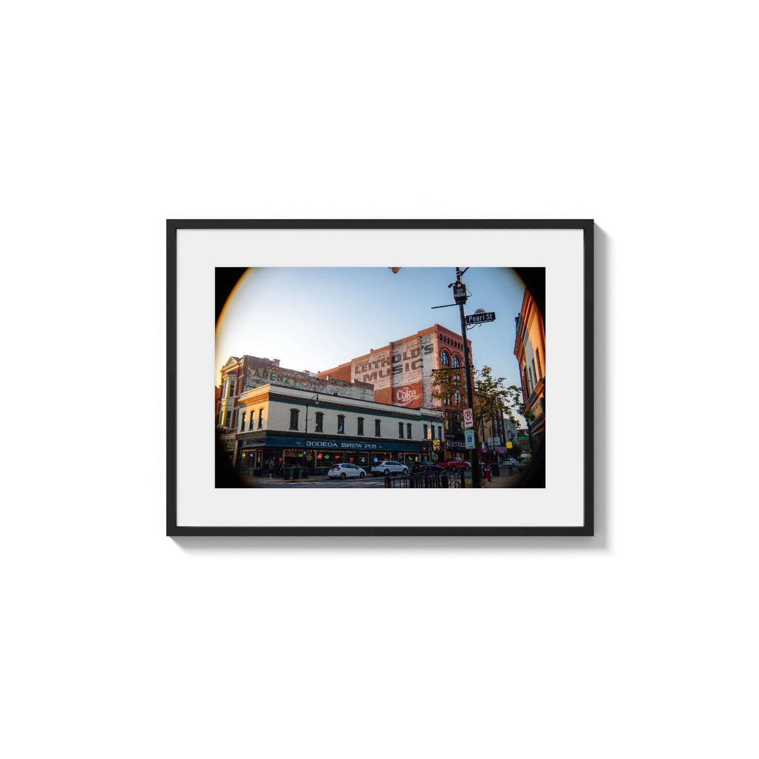 Keywords: Downtown, architecture, historic buildings, commercial district, brickwork, vintage signage, street photography, golden light, urban scene, pub, intersection