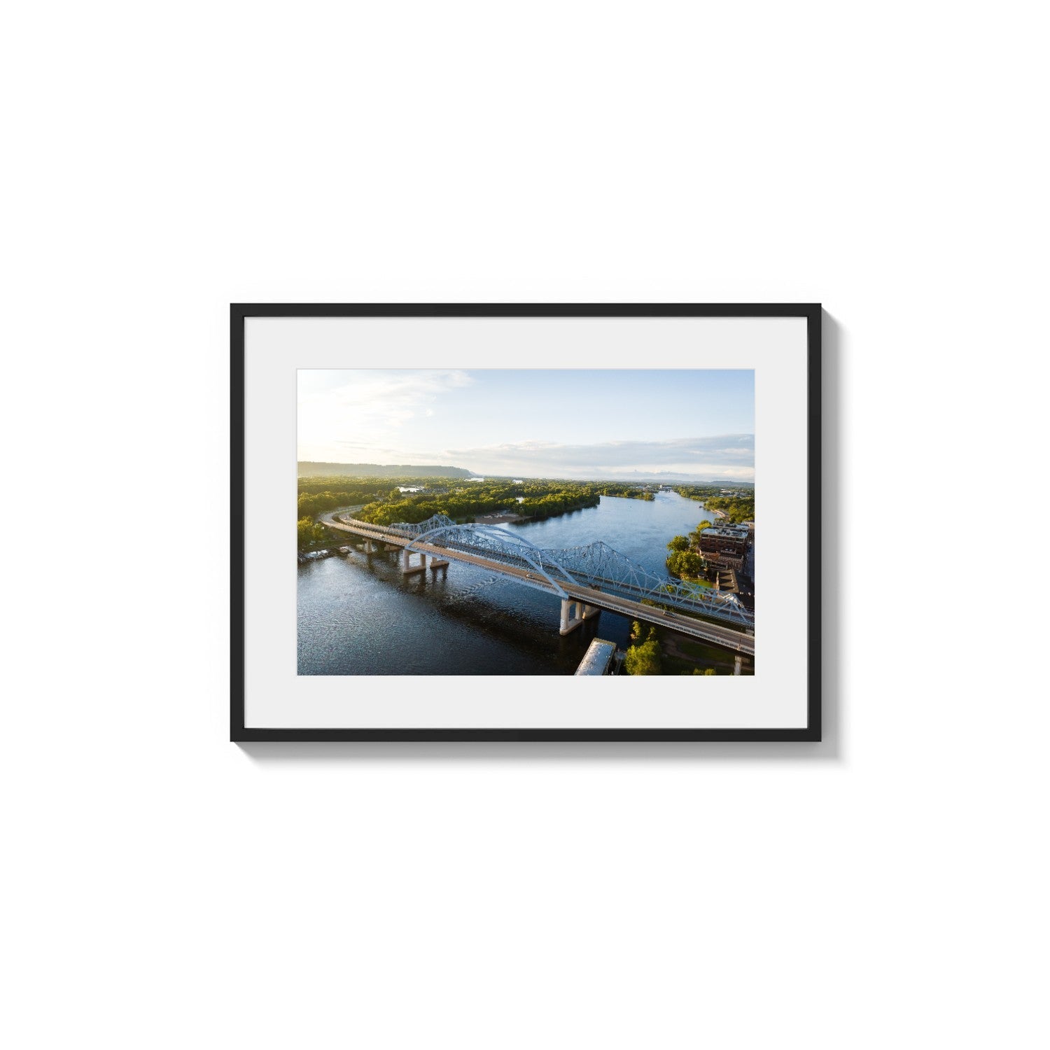 Keywords: Aerial photography, truss bridge, river landscape, cityscape, golden hour, scenic view, blue river, infrastructure, urban landscape.