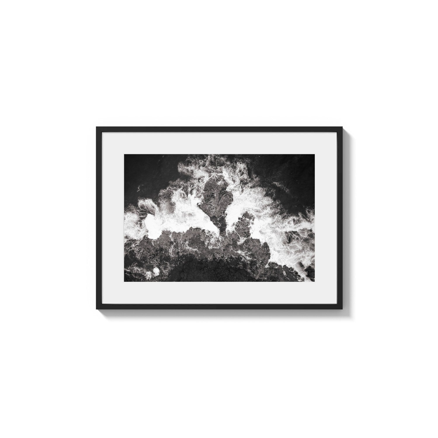 The composition captures the powerful interaction between agitated expanse and rugged geology. Rendered in monochromatic tones, the contrast is stark: brilliant bursts of froth sharply define the contours of the deeply shadowed, porous land. The perspective emphasizes the raw energy of the movement and the texture of the turbulent surface.