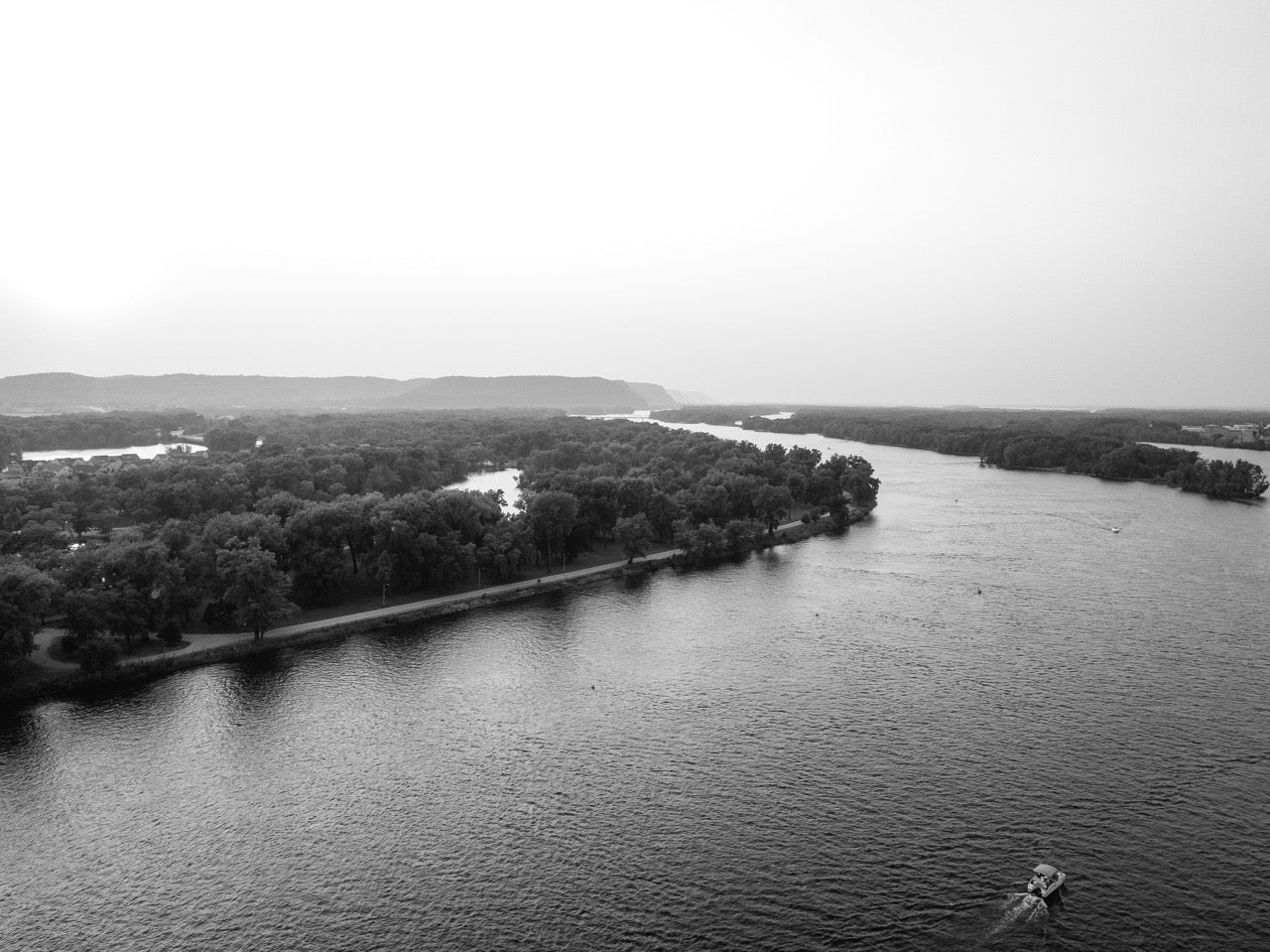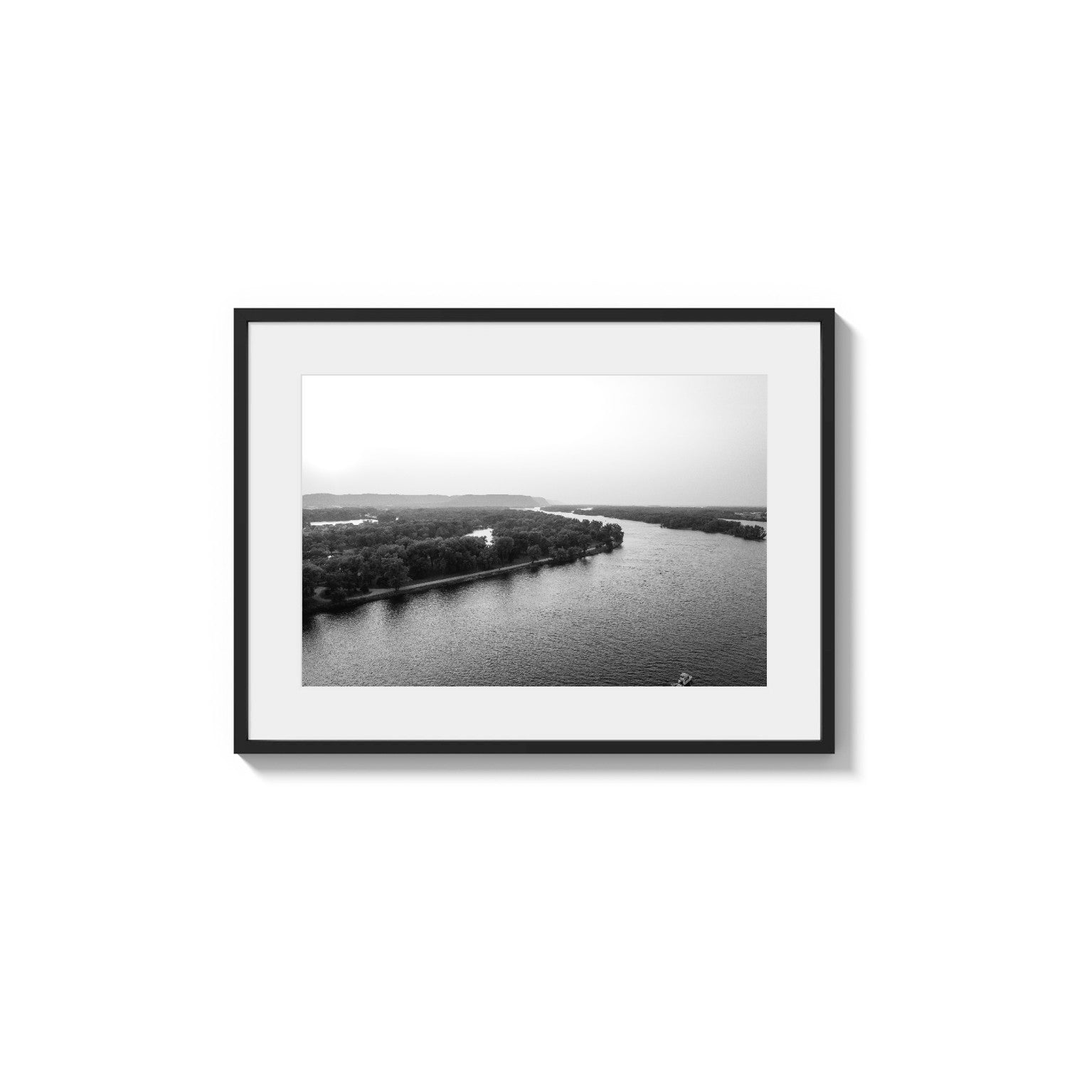 Keywords: Black and white photography, elevated perspective, monochrome, aqueous course, large channel, natural expanse, high angle, textural, atmospheric, topography, dense growth