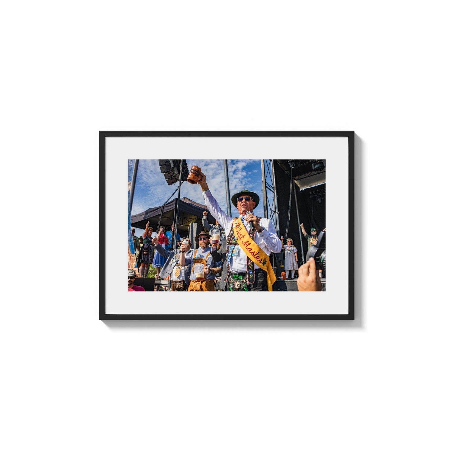 A low-angle photograph captures a celebratory moment on an outdoor festival stage. A central figure, wearing a wide-brimmed hat, sunglasses, and embroidered traditional garments with an orange "Fest Master" sash, holds a wooden stein triumphantly overhead. He speaks into a microphone while others in festive dress stand behind him, raising their mugs. The composition is brightly lit against a vivid blue sky dotted with scattered clouds, emphasizing the joy and communal atmosphere of the event.