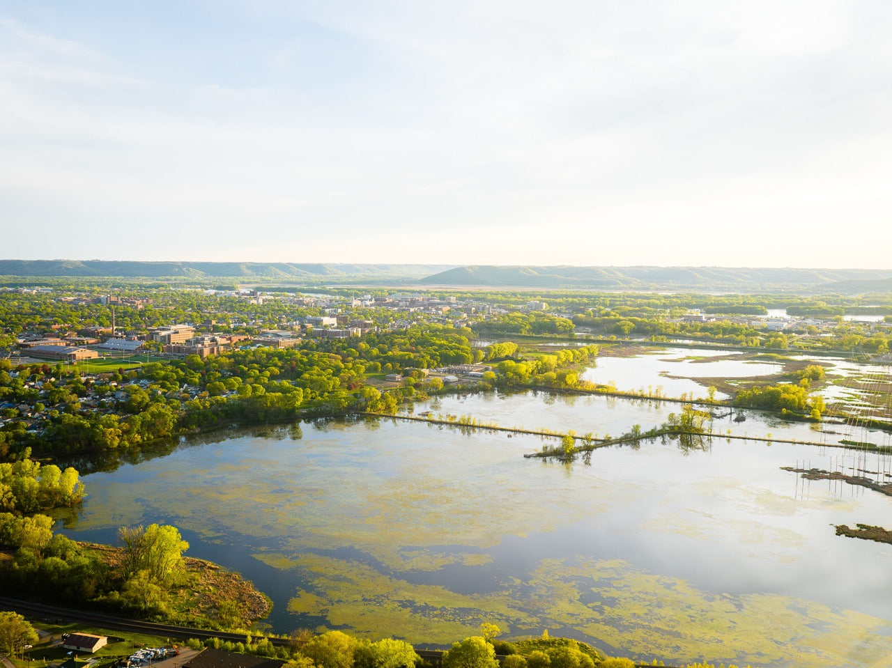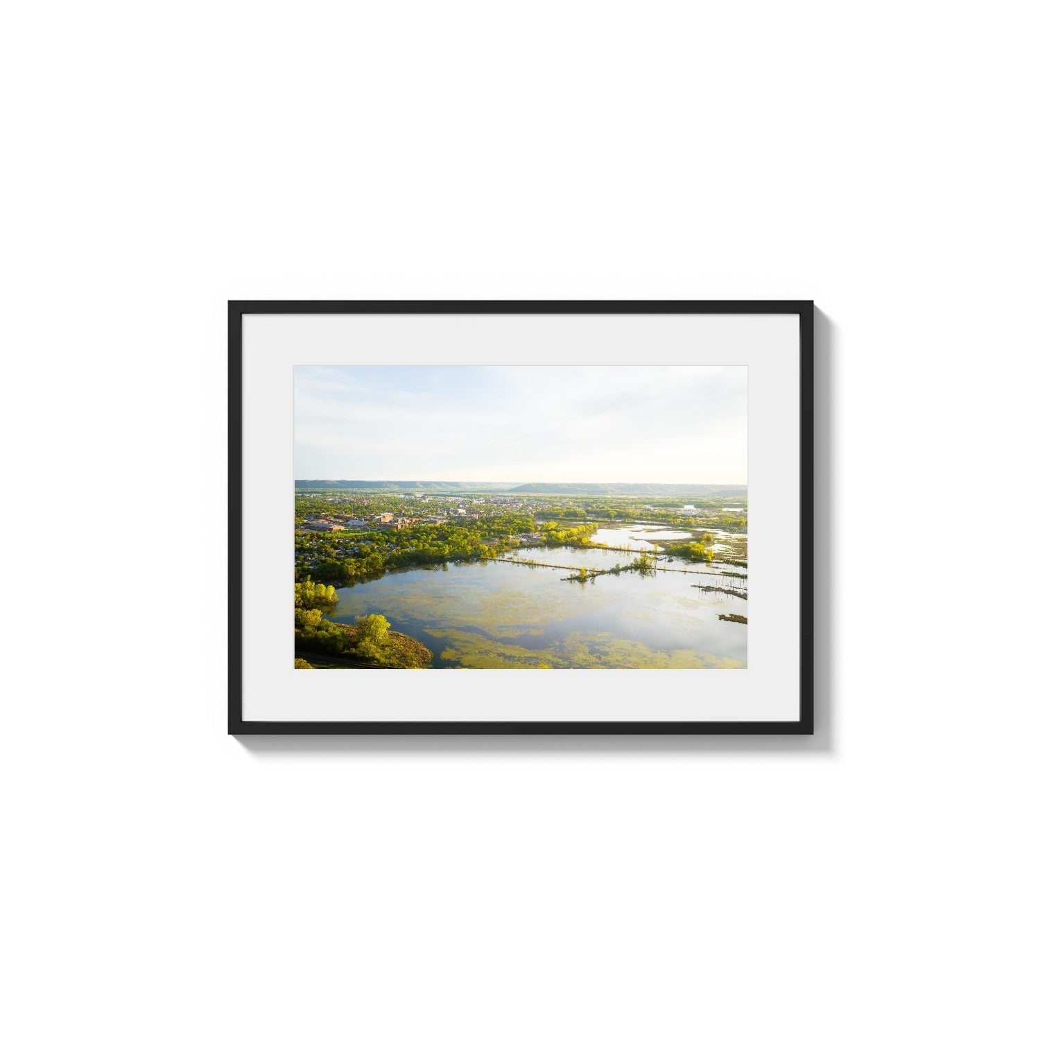Keywords: Aerial photography, suburban, residential area, lake, pond, wetlands, green growth, golden light, elevated, townscape, architecture, environment, ecosystem, warm tone, tranquil, panorama, summer