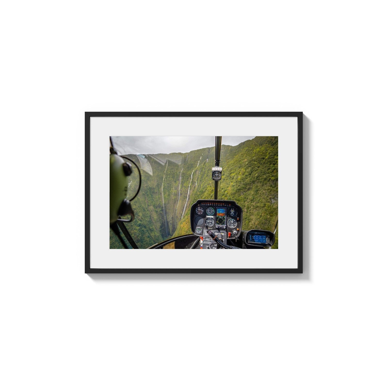 Keywords: Aerial photography, helicopter interior, cockpit instruments, gauges, lush foliage, cascade, rainforest, island exploration, adventure travel, deep gorge, nature tourism, extreme landscape, aviation