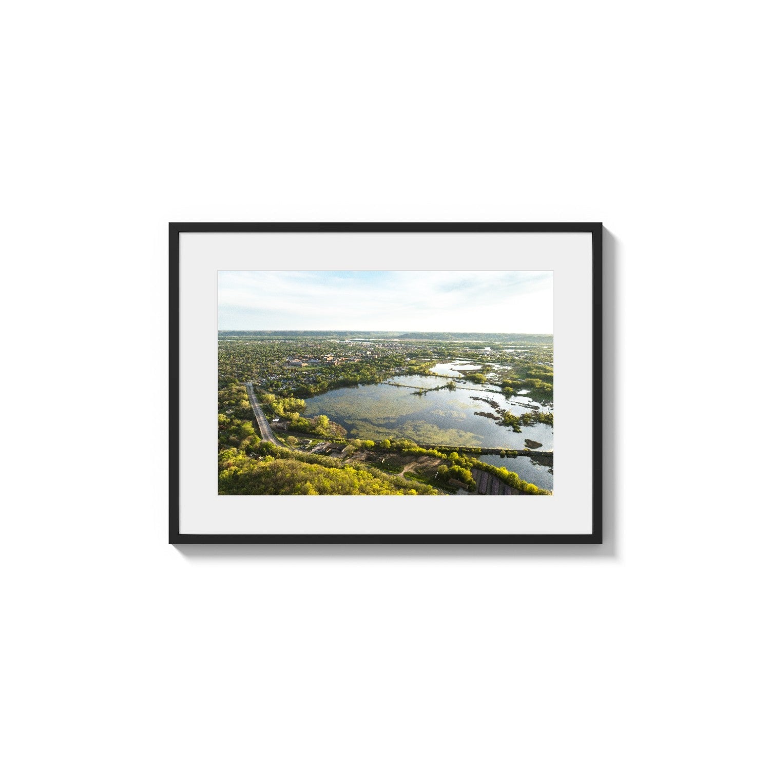 Keywords: Aerial photography, wetlands, landscape photo, drone shot, vibrant green, suburban, nature art, reflective water, urban sprawl