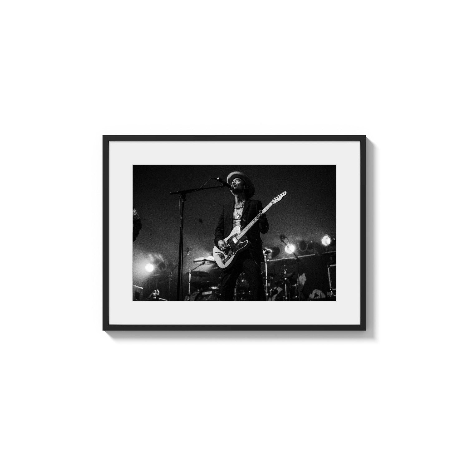 A striking monochromatic photograph captures a musician commanding the stage during a live concert. The central figure, dressed in a suit and hat, is playing a white electric guitar, illuminated primarily by powerful backlights that create strong contrast and dramatic flair. The high-grain texture enhances the raw energy of the performance. Drums and other band members are visible faintly in the background, reinforcing the dynamic concert atmosphere.