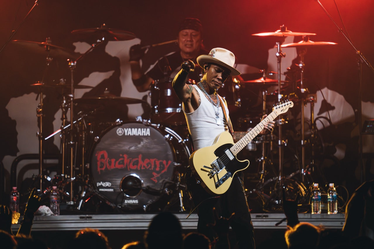 Keywords: Live concert, musician, guitarist, rock and roll, stage performance, red lighting, dramatic photography, band, Buckcherry.