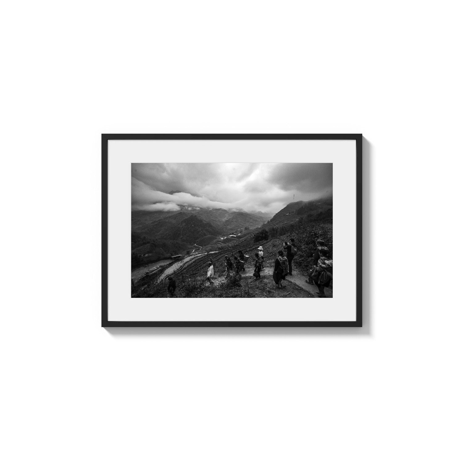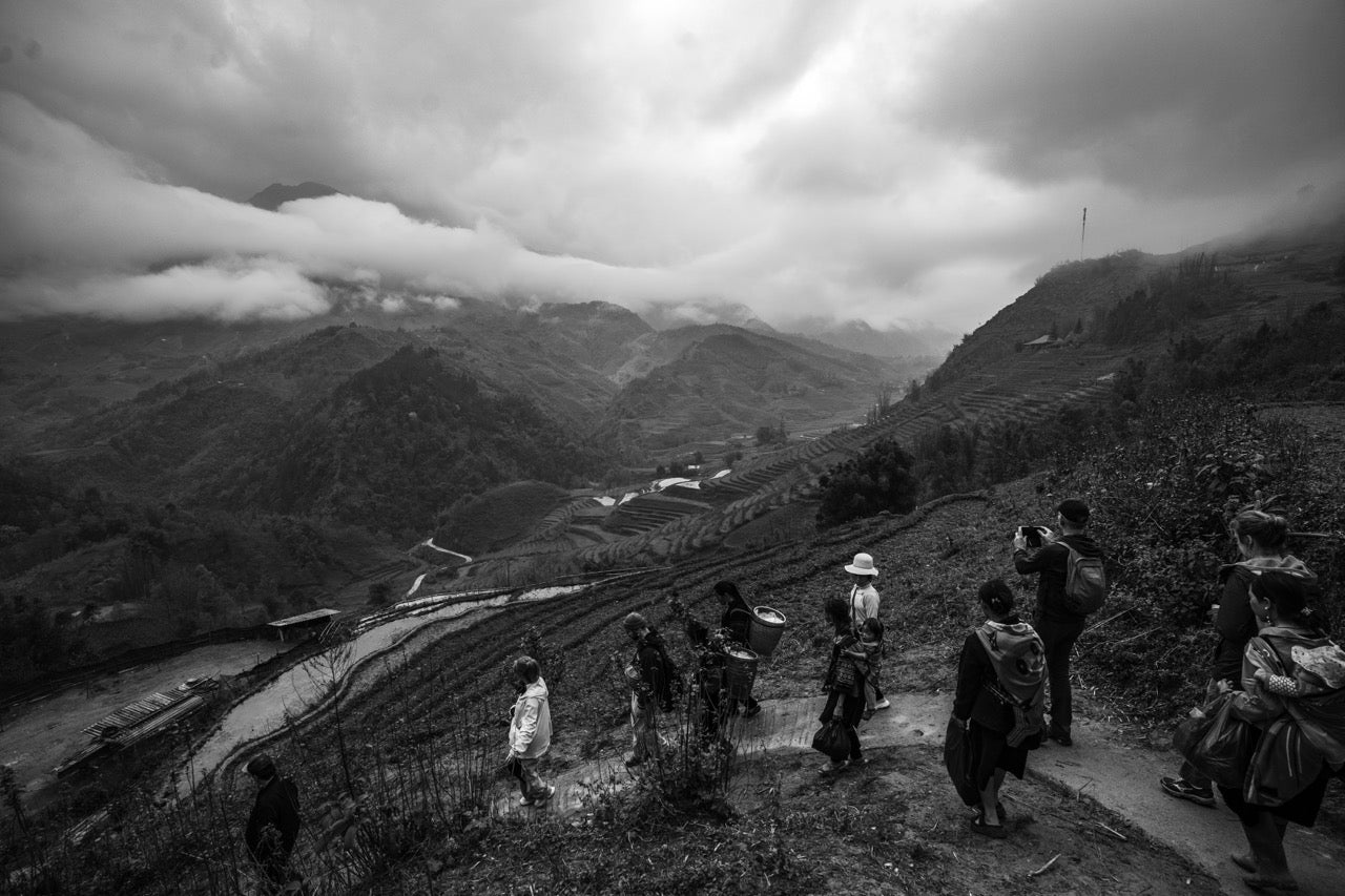 This monochromatic photograph captures a group of figures traversing a narrow, graded earth track. The people, dressed in traditional garb, carry heavy loads and move across the foreground. The scene extends into an extensive system of agricultural grading built into steep, contoured hillsides. Overcast skies dominate the upper portion, where thick banks of atmosphere obscure the uppermost sections of the rugged elevation, providing a powerful sense of depth and drama.