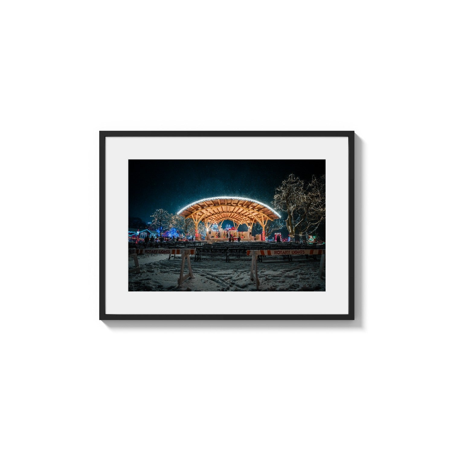Keywords: Winter, night photography, holiday lights, Christmas display, snow, gazebo, illuminated structure, festive, cold, dark sky, moody.