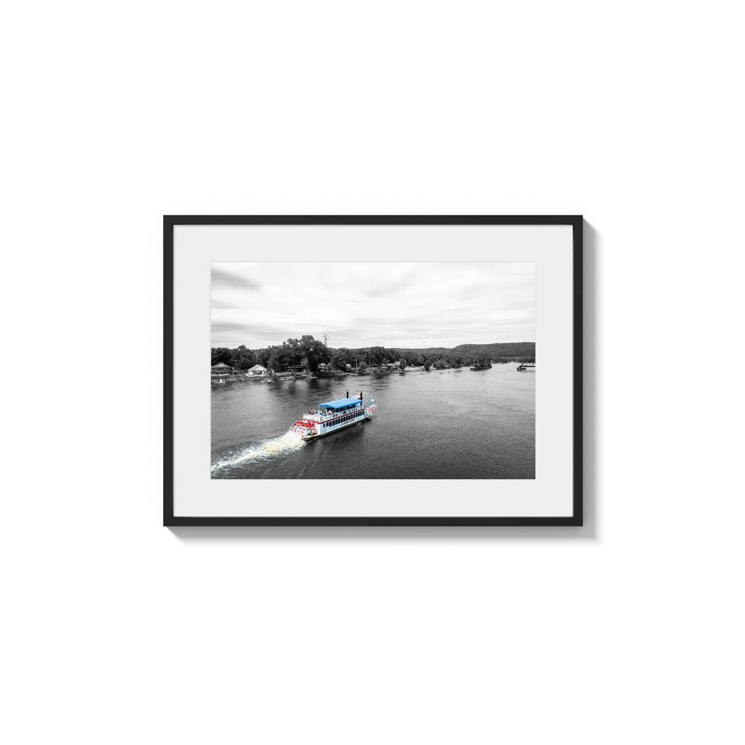 Keywords: Steamer, paddlewheeler, nautical craft, selective color, grayscale photography, inland navigation, historic vessel, travel, movement, shoreline, hull