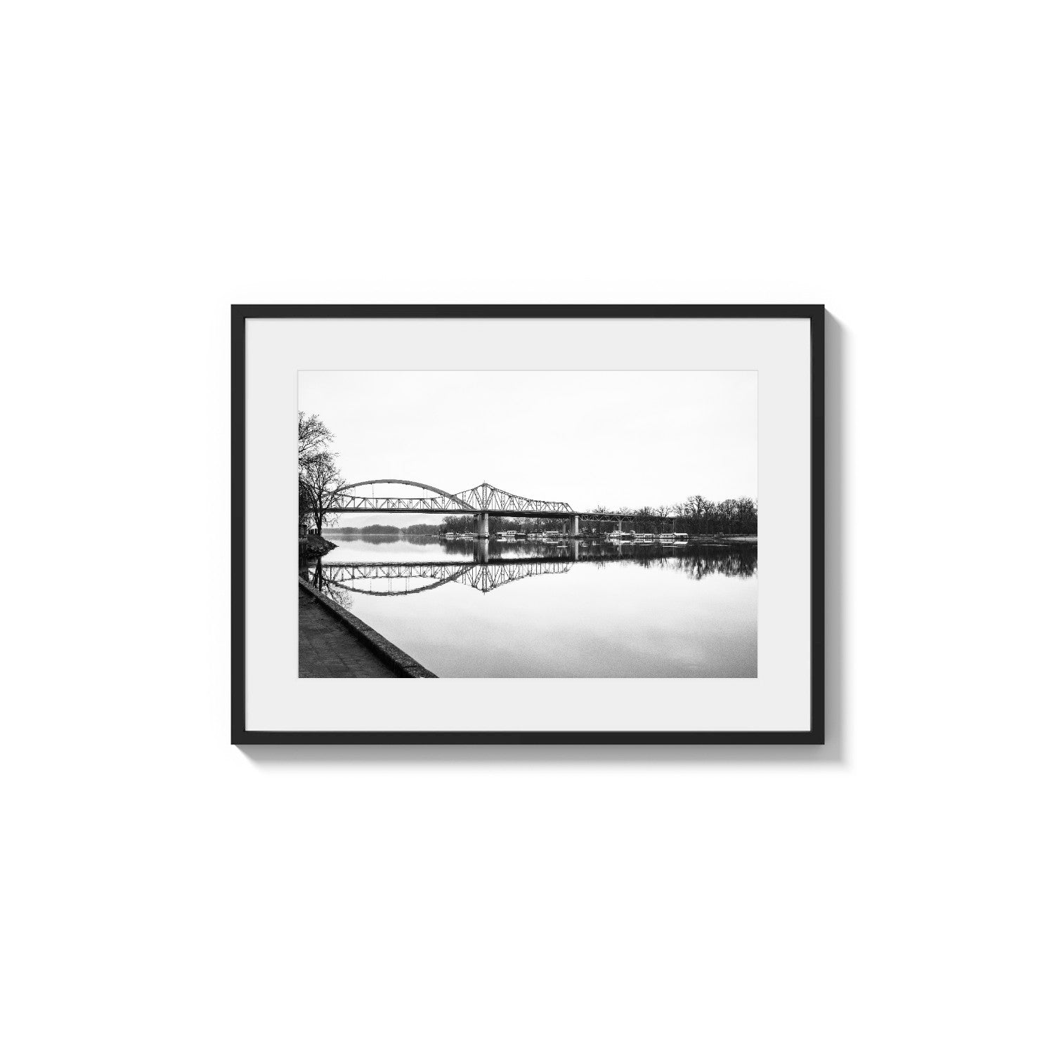 Keywords: Architecture, infrastructure, black and white, monochrome, waterway, engineering, symmetry, stillness, geometry, transportation crossing, truss structure