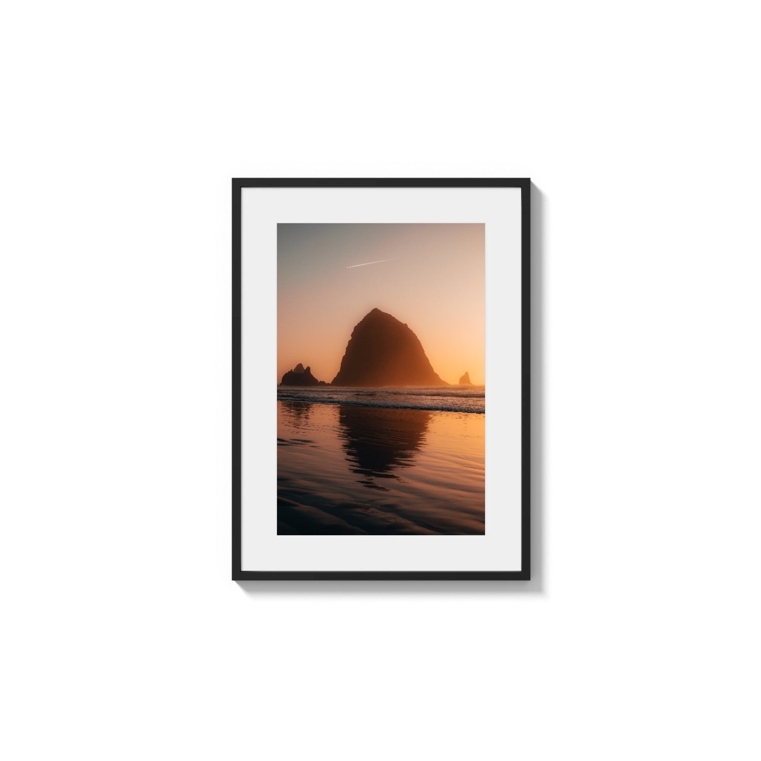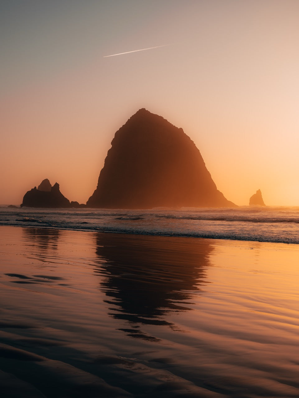 This stunning landscape captures a dramatic sea stack silhouetted against a vibrant sunset. The sun's warm glow saturates the sky with rich oranges and golds, which are deeply reflected in the wet sand of the foreground beach. The massive rock formation stands as a dark monument, creating a high-contrast, moody aesthetic. A faint jet contrail streaks across the subtly graded sky above the scene.