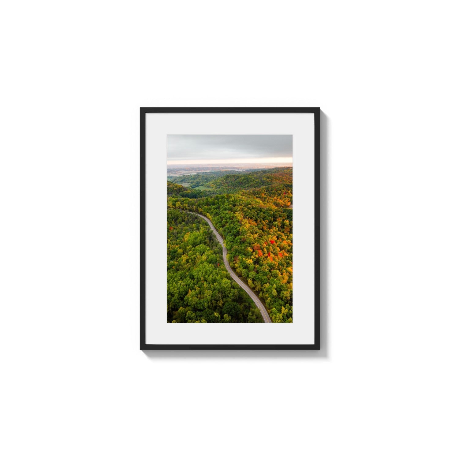 Keywords: Photography, scenic, nature, woodlands, rolling hills, colorful foliage, elevated perspective, autumn decor, season transition, earthen tones, asphalt, outdoor, travel, vehicle access