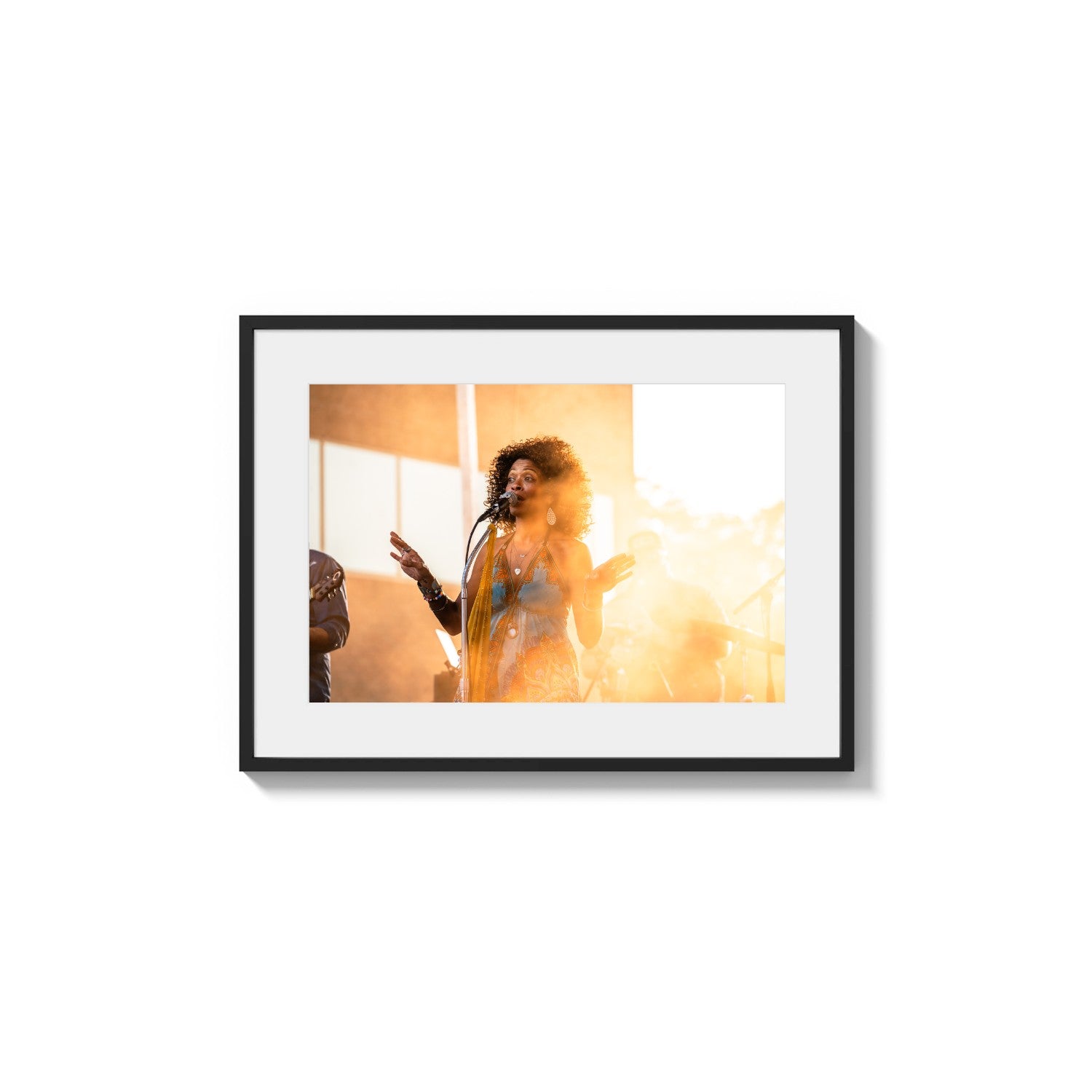 A dynamic photograph captures a vocalist mid-song, addressing an audience. Her voluminous, textured hair is framed by tremendous backlighting, producing a photographic bloom. She wears a printed dress and bracelets, her hands open in expressive communication. The scene is dominated by hues of citrus and saffron, emphasizing the powerful energy emanating from the central human representation. Musical instrumentalists are blurred specters in the background.