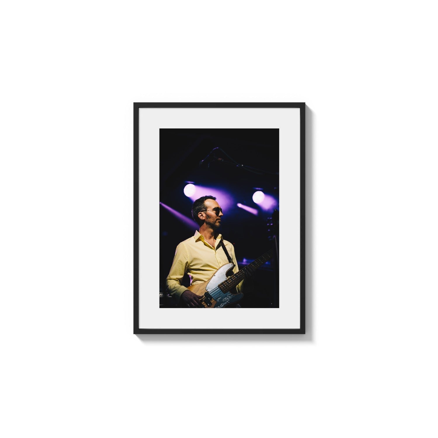 Keywords: bassist, live event, electric instrument, concert photography, magenta illumination, low key, musical act, yellow apparel
