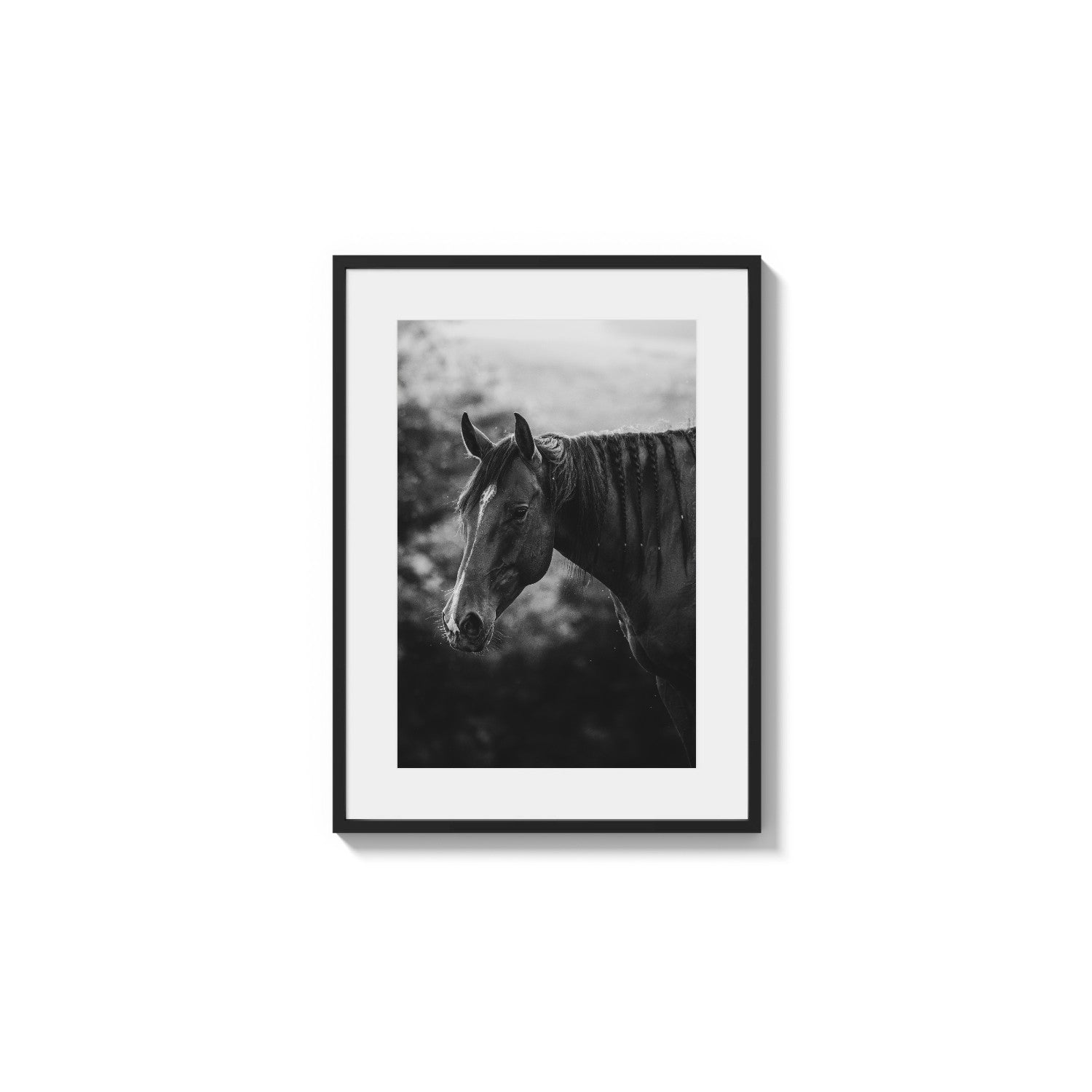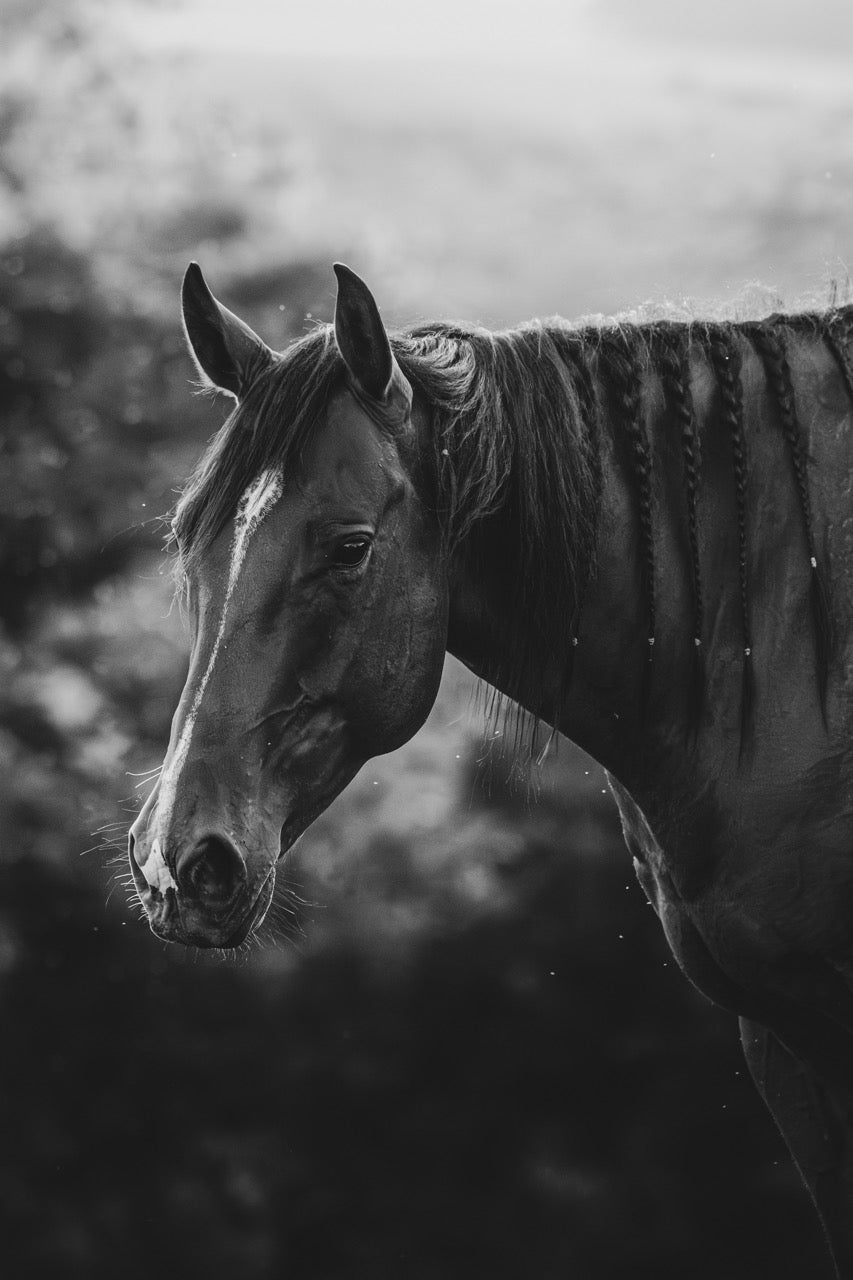 Keywords: Equestrian, grayscale photography, fauna depiction, stallion, mare, farm life, muzzle, illumination, braids, portraiture, livestock, western, equine figure, riding culture, digital print
