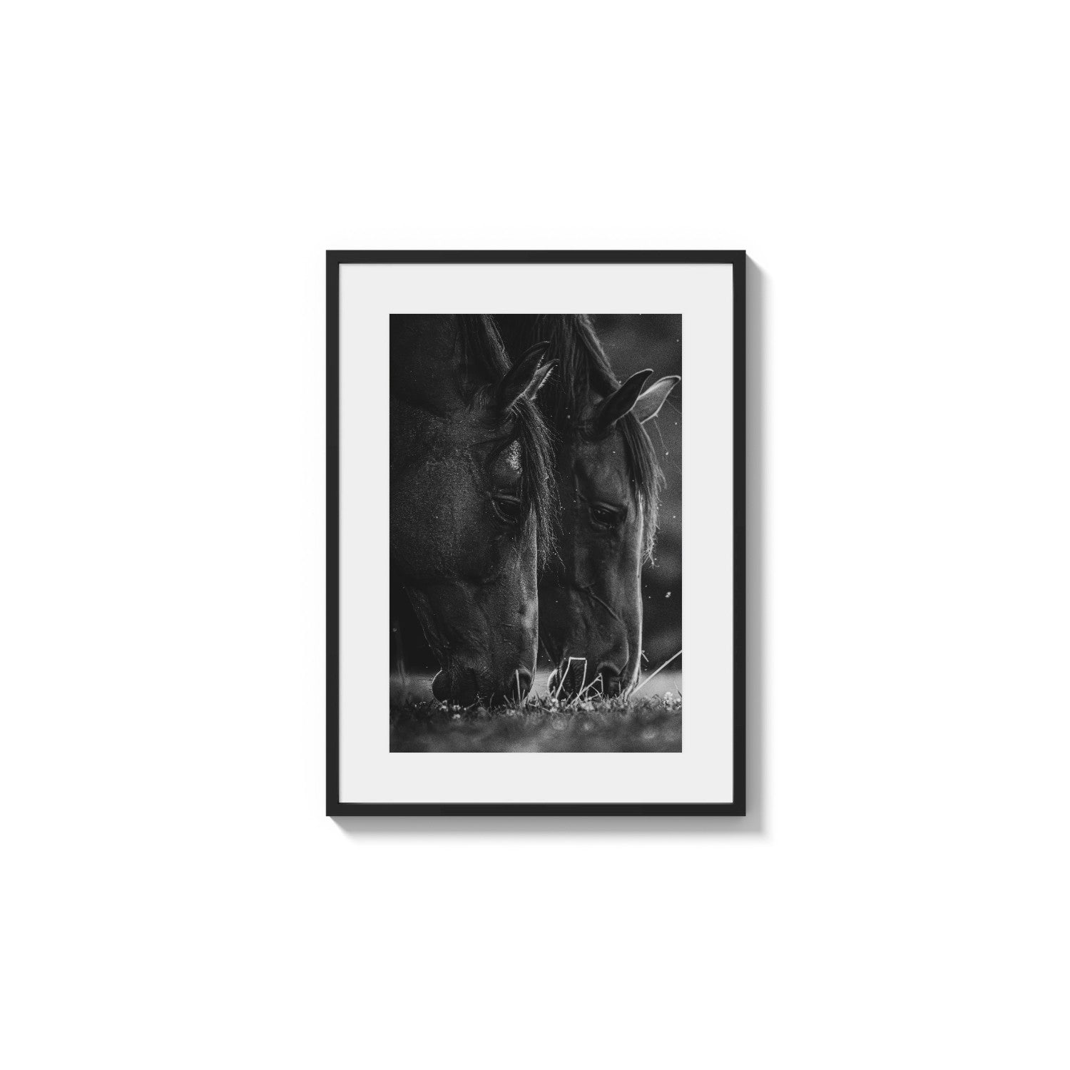 Keywords: Horses, equine, black and white photography, monochrome, animal portrait, grazing, high contrast, dramatic, fine art print, nature.