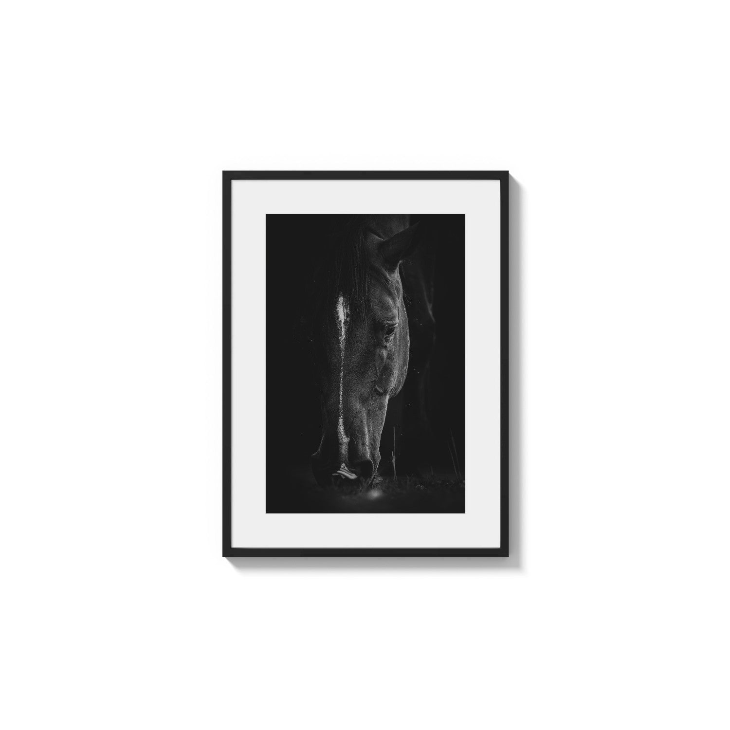 Keywords: B&W photography, black and white, mammal, dramatic lighting, low key, artistic, modern art, wall art, domestic stock, livestock, equine, close-up, photography, fine art print, cinematic, muzzle, feeding, monochrome