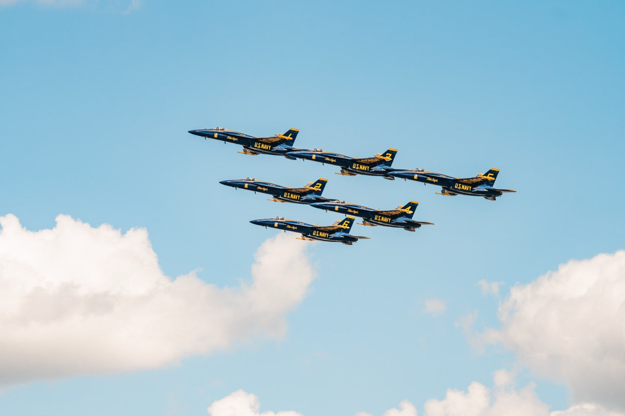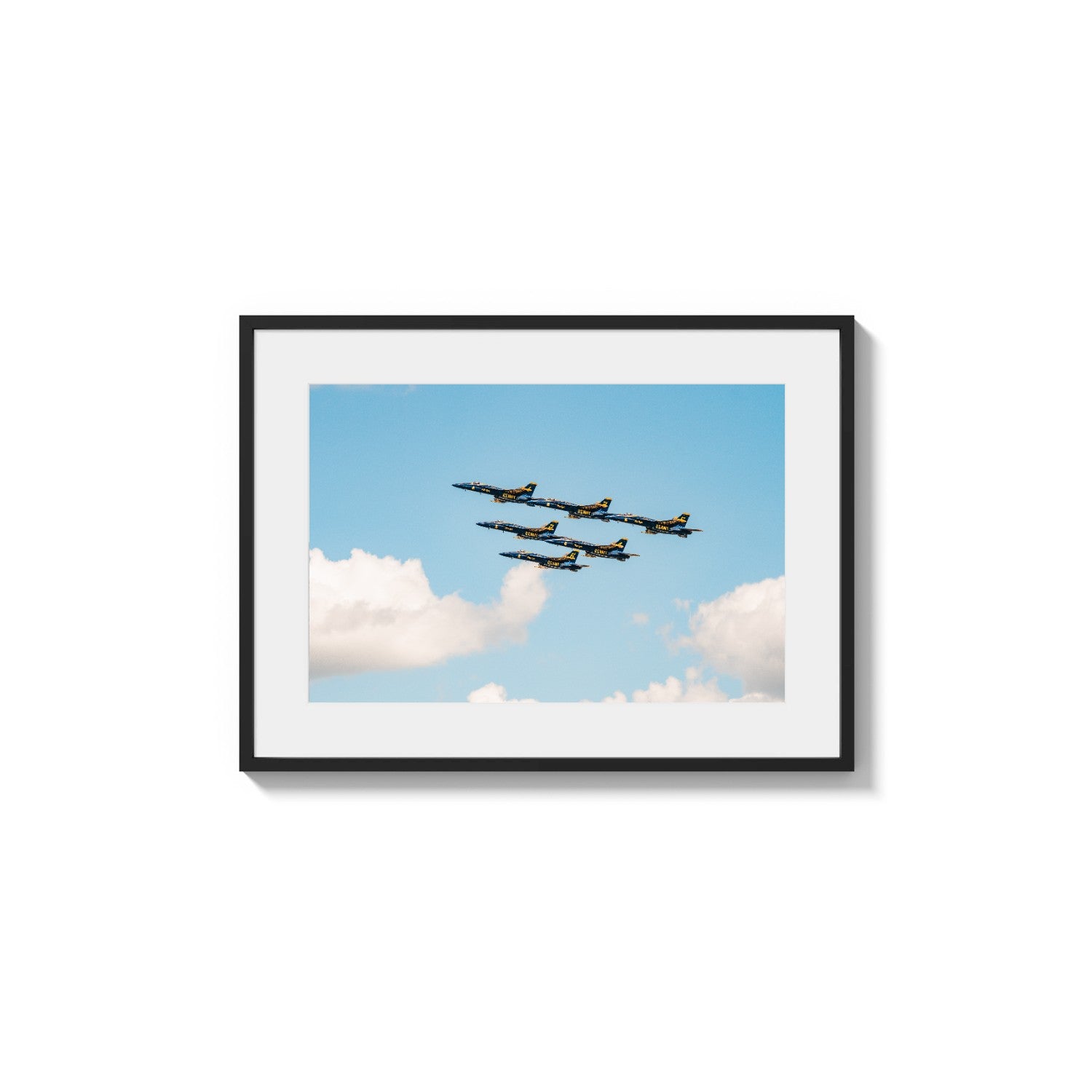 Keywords: Aviation, warplanes, aerobat, six craft, diamond pattern, gold and navy, airshow exhibit, synchronized flying