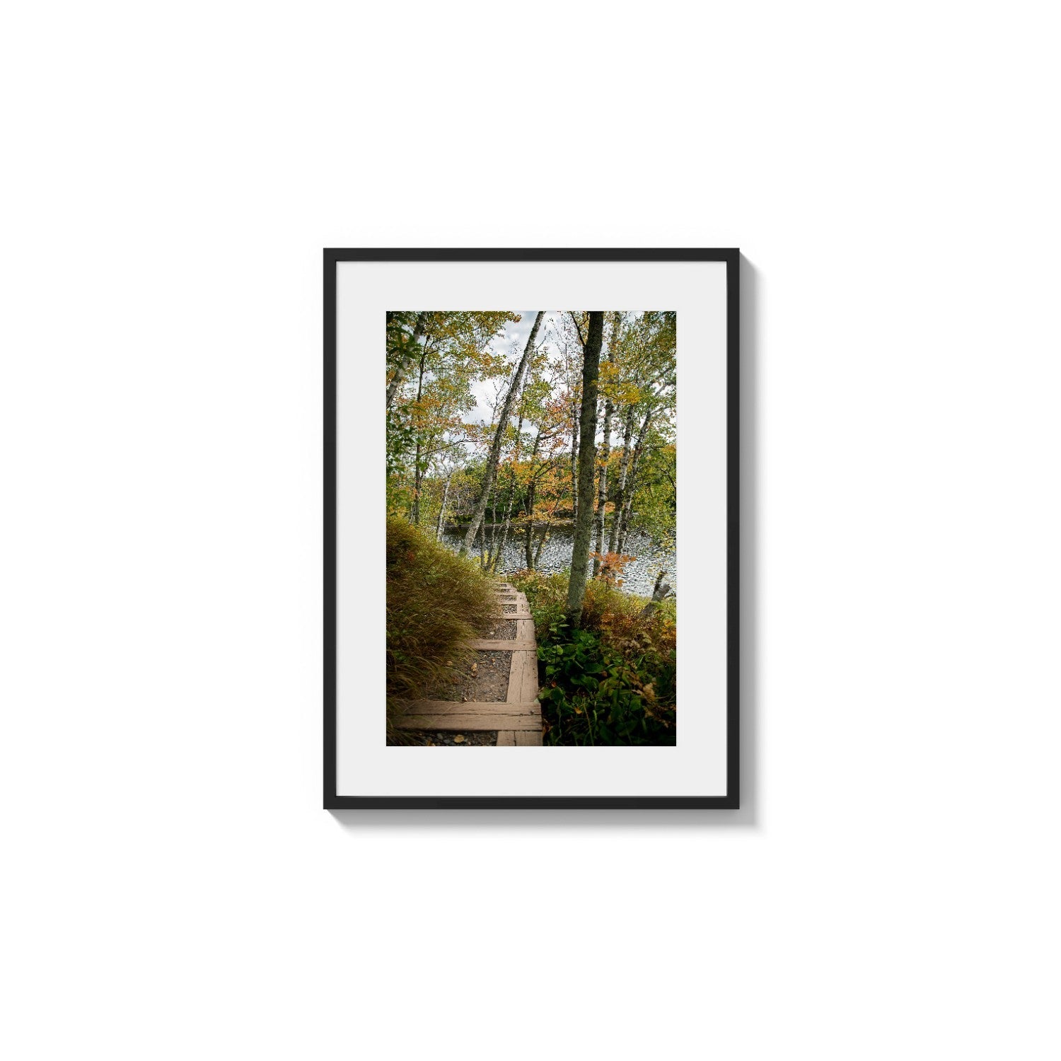 A vertical photograph captures a rustic wooden path descending through dense foliage toward a hidden body of water. The scene is dominated by autumn colors—vibrant greens, golden yellows, and rich browns. Tall, slender trees frame the composition under a soft, overcast sky, emphasizing the secluded, natural atmosphere of the lakeside trail.