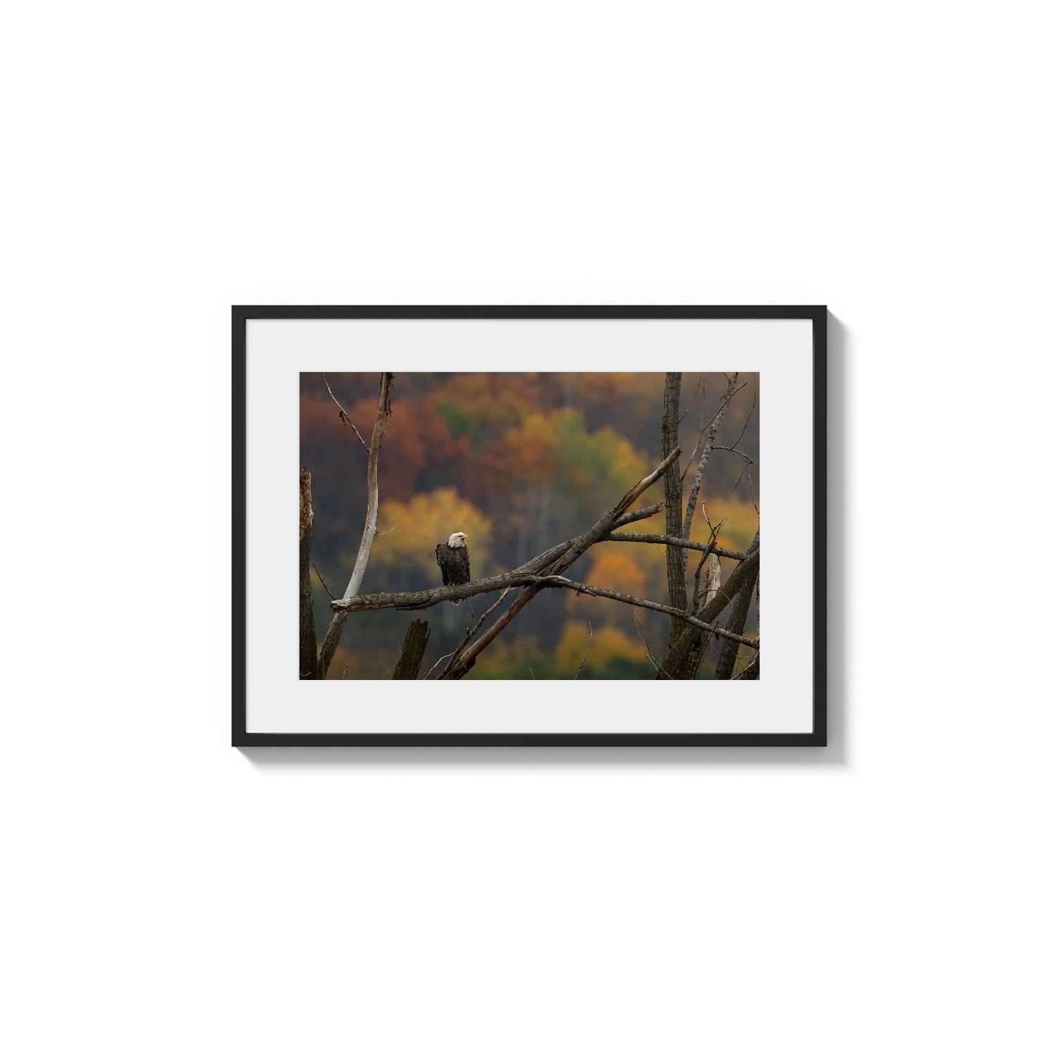 Keywords: Bald Eagle, bird photography, wildlife, nature, raptor, perched, avian, fall colors, seasonal change, dead branches, bokeh, USA national symbol, predator