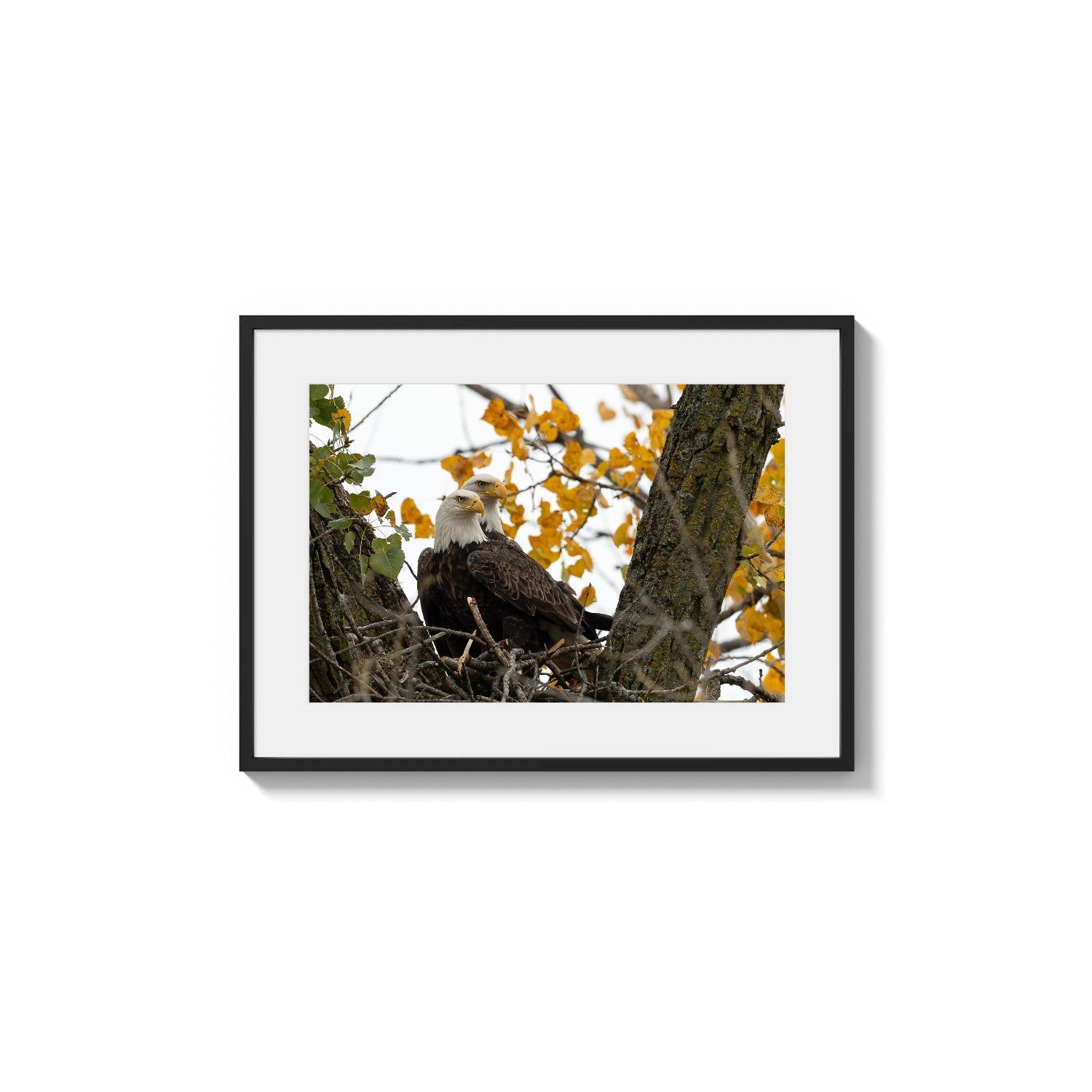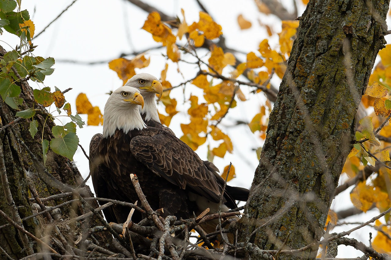 Keywords: Bald eagles, raptor, wildlife photography, bird of prey, nature, nest, autumn, fall foliage, golden leaves, American eagle.