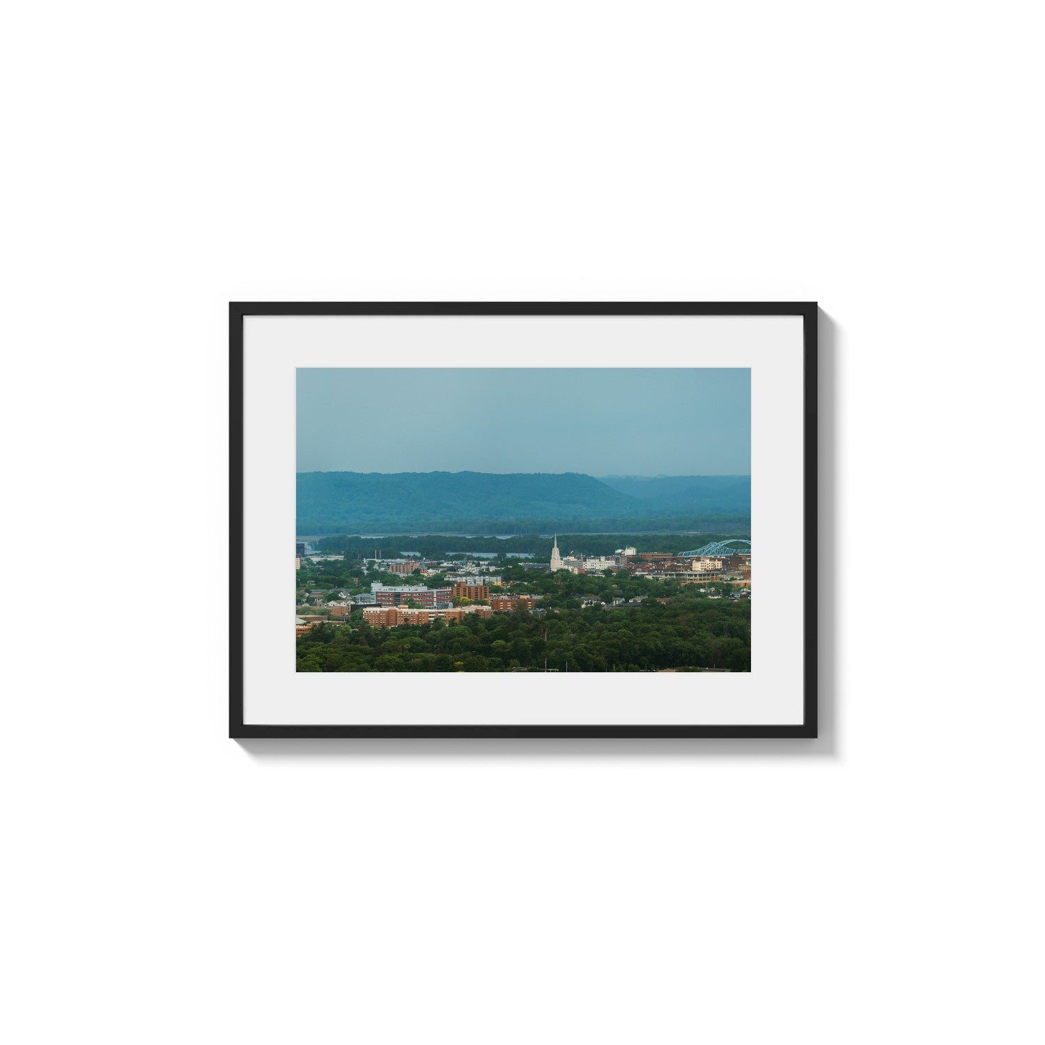 This unique perspective of La Crosse shows the abundance of nature even within our city limits. The foreground features densely packed structures of brick and terracotta hues mixed with deep green foliage. A prominent white spire marks the heart of the settlement. The background reveals receding layers of gentle, contoured terrain, colored in muted slate and pale teal under a diffused atmosphere.