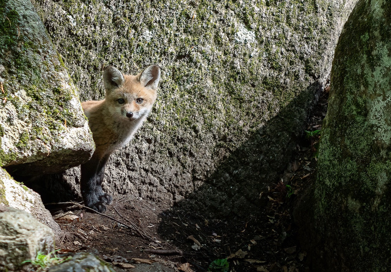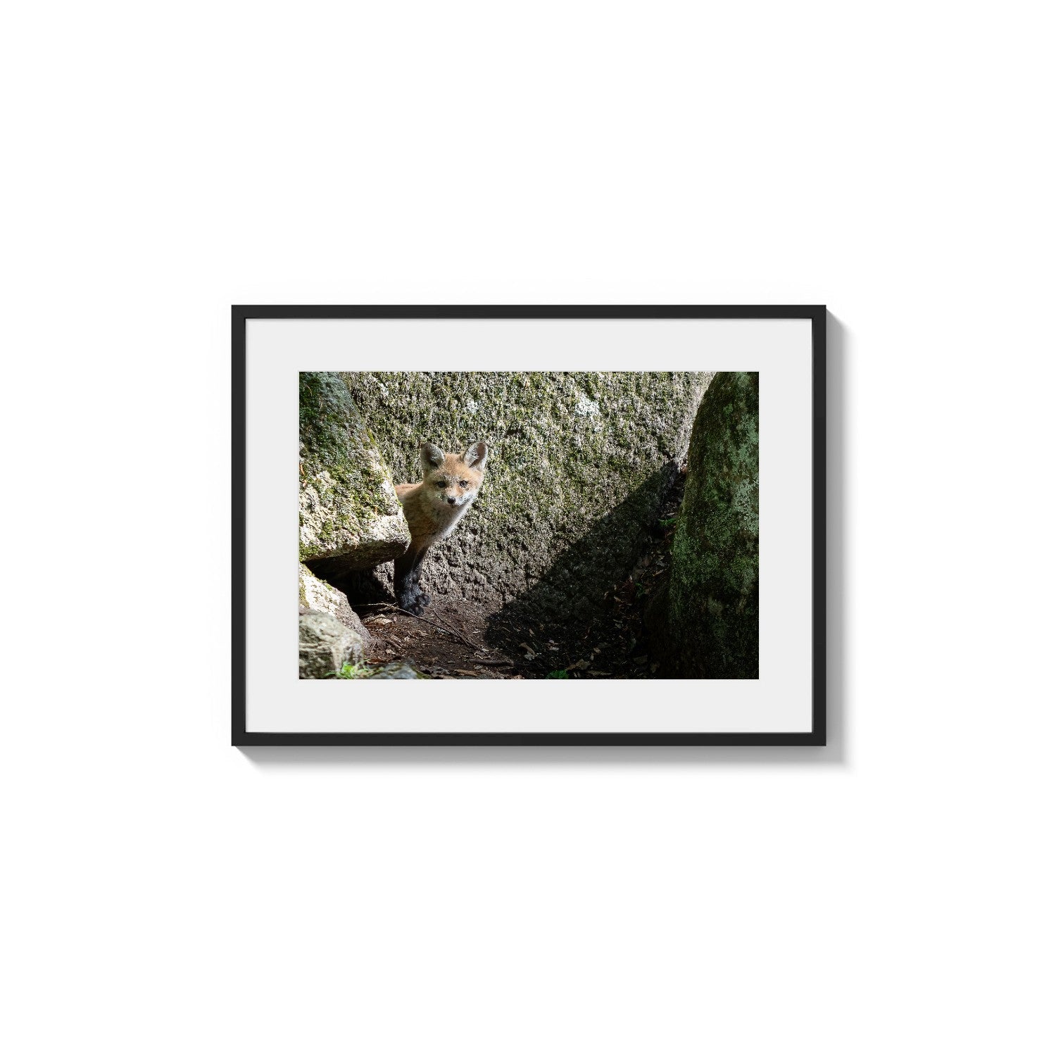 Keywords: Fox, kit, wildlife photography, nature, animal, rocky den, moss, high contrast, wilderness, woodland.