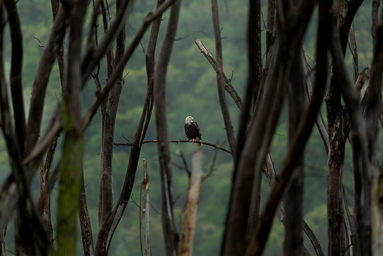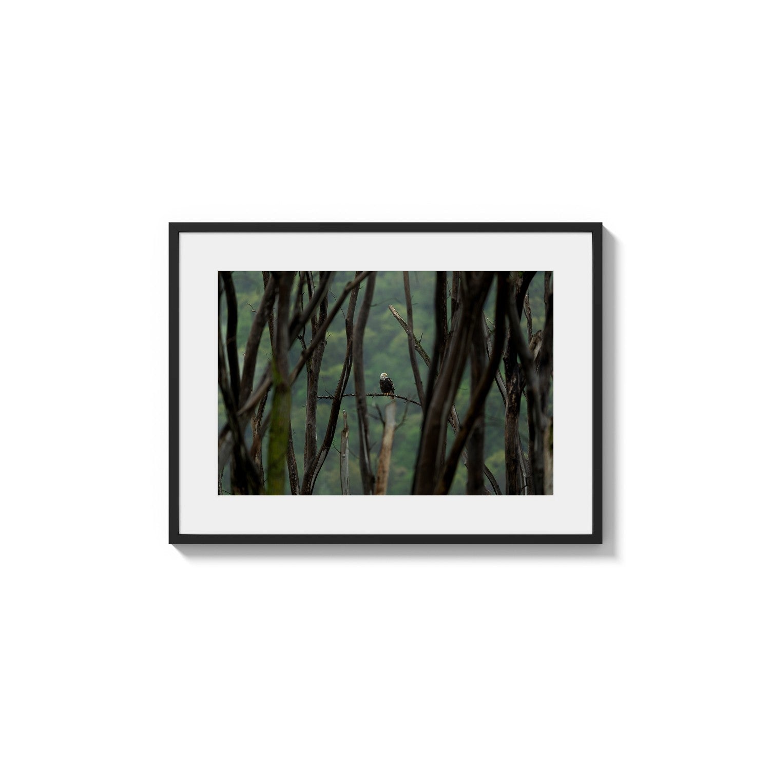 Keywords: photography, nature composition, vertical lines, geometric framing, dense barrier, brown tones, lush environment, feathered creature, animal habitat, centered subject, isolation, raptorial