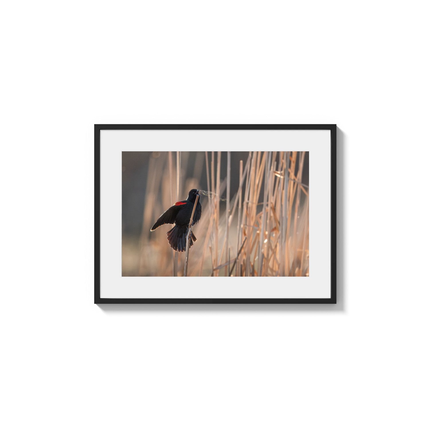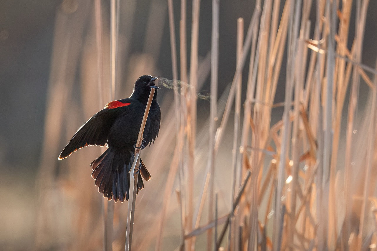 Keywords: bird photography, wildlife, marsh, reeds, avian, blackbird, nesting material, nature, natural habitat, macro, sunlight effect, edges, cattail marsh