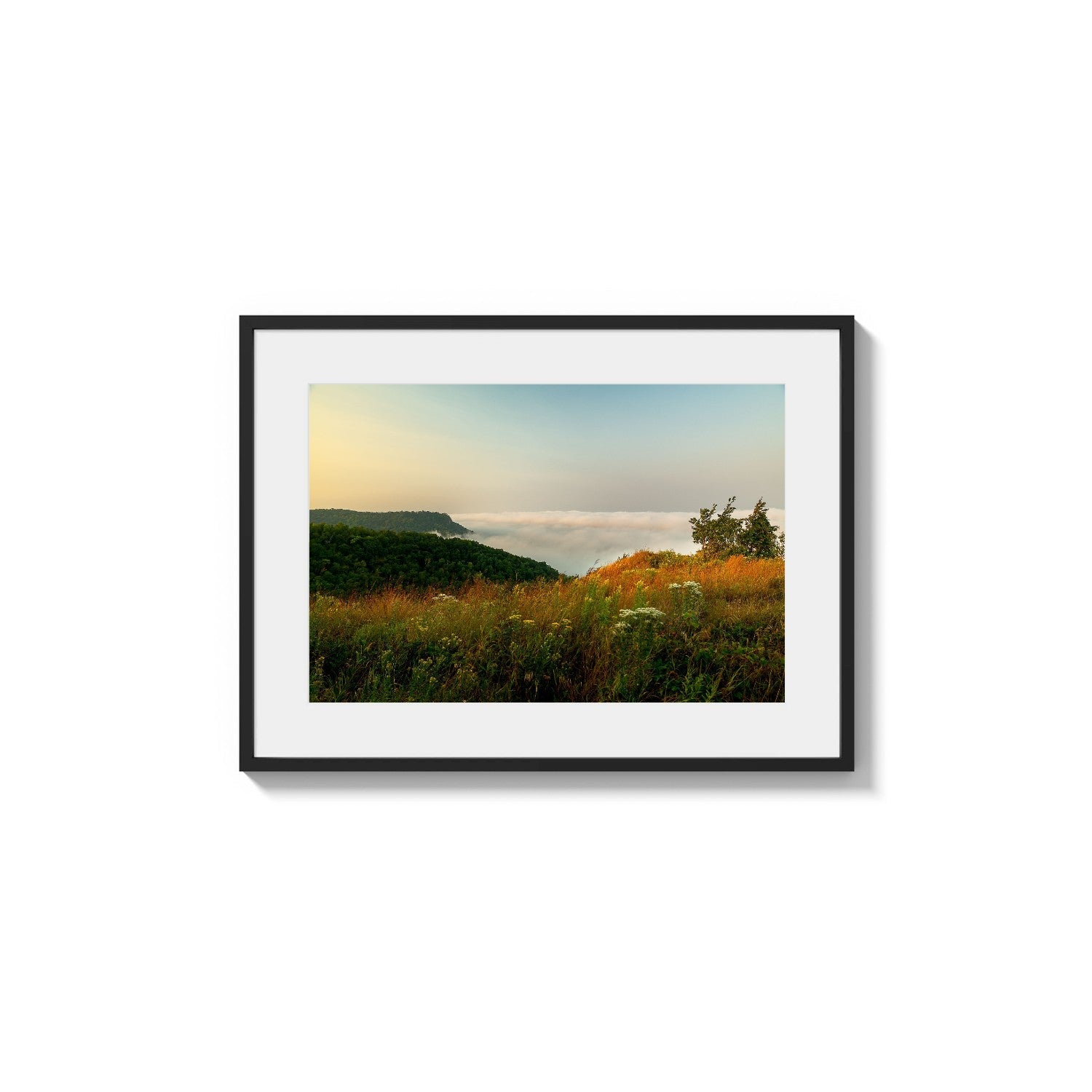 This elevated photograph captures a sweep of tall grasses and wildflowers illuminated by soft, golden light. The foreground displays rich textures of reddish-brown and emerald foliage. Below the immediate terrain, a thick, cotton-like blanket of low clouds covers the area beyond the dark green wooded slopes. The sky shifts subtly from pale blue at the top to yellow where it meets the ethereal cloud layer, suggesting an early period of day.