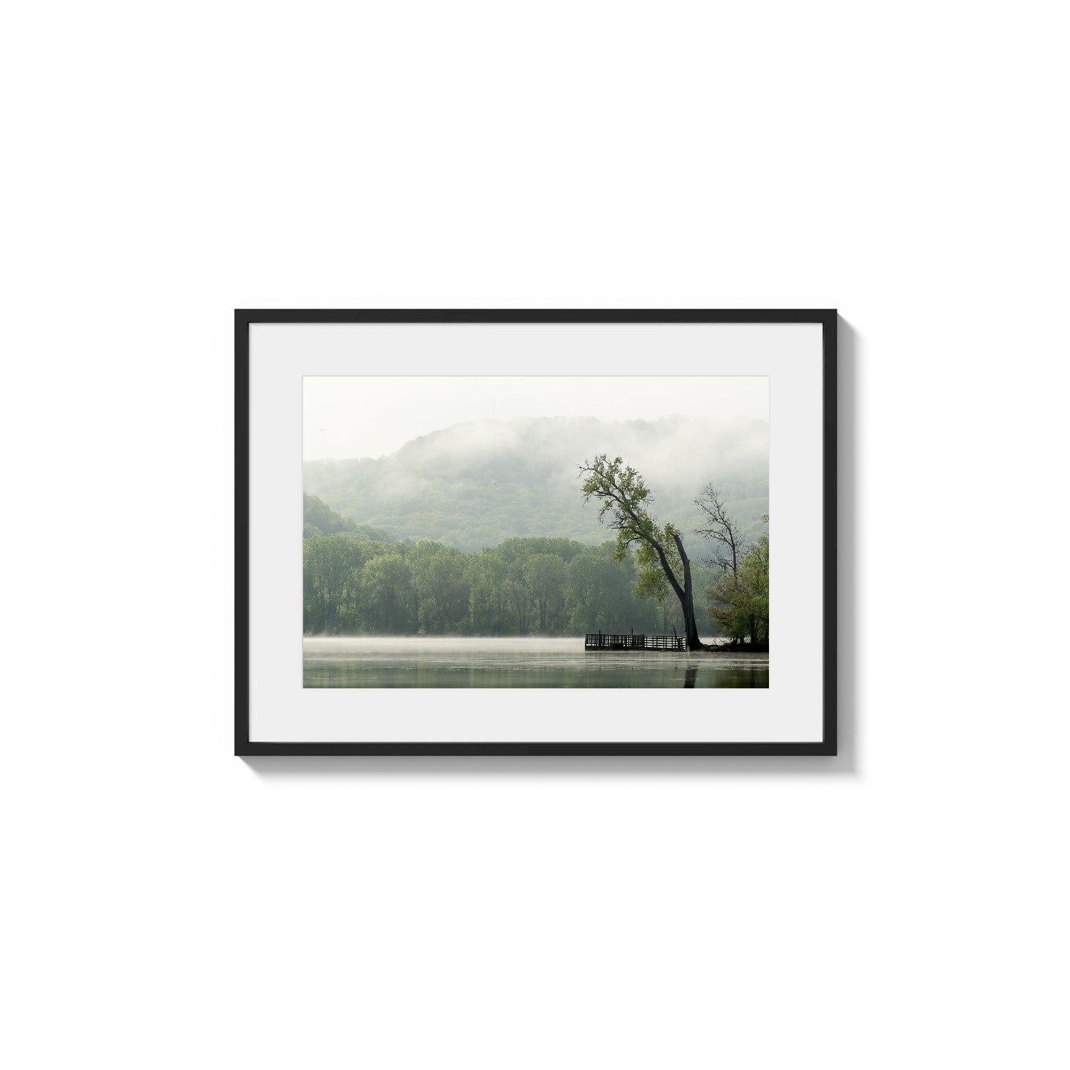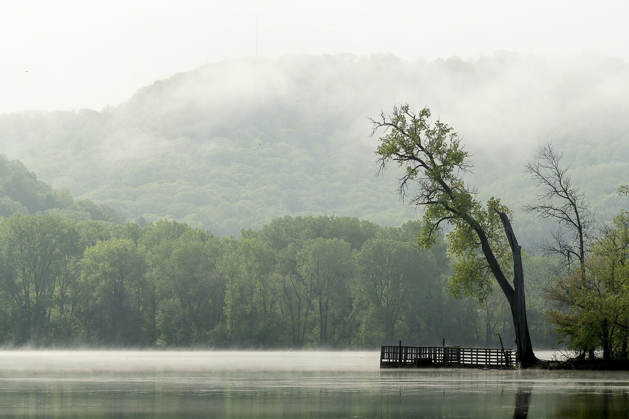 This photograph captures a tranquil natural setting. Rolling, heavily wooded hills rise into a dense cloud cover, creating a soft, obscured background. A layer of fine vapor hovers above the smooth, liquid surface in the foreground. A distinct, partially leafless tree leans dramatically beside a simple wooden landing structure near the treeline. The image utilizes a palette dominated by lush, muted greens and soft whites.