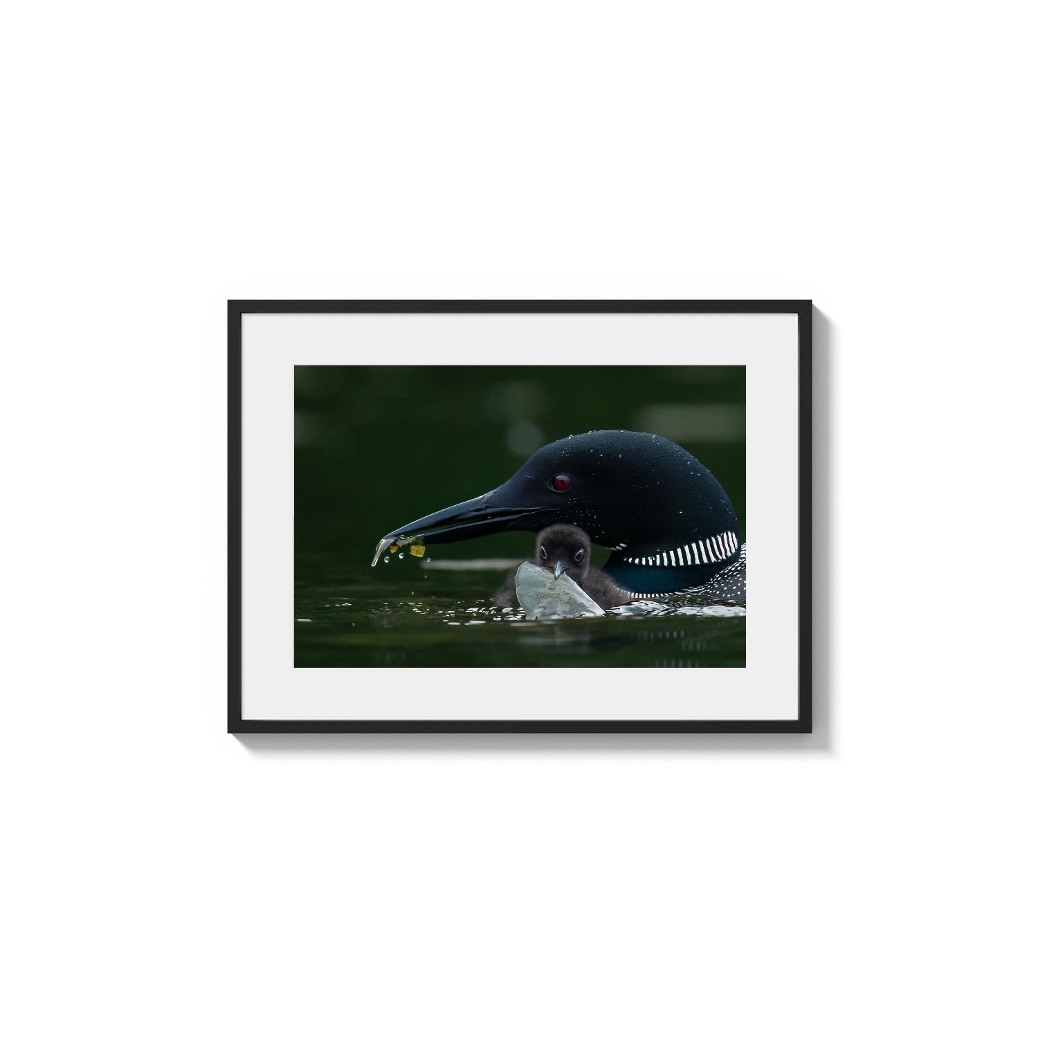 Keywords: wildlife photography, avian parent, Gavia Immer, motherhood, nature documentary, fowl, intimacy, red eyes, symbiosis, newborn