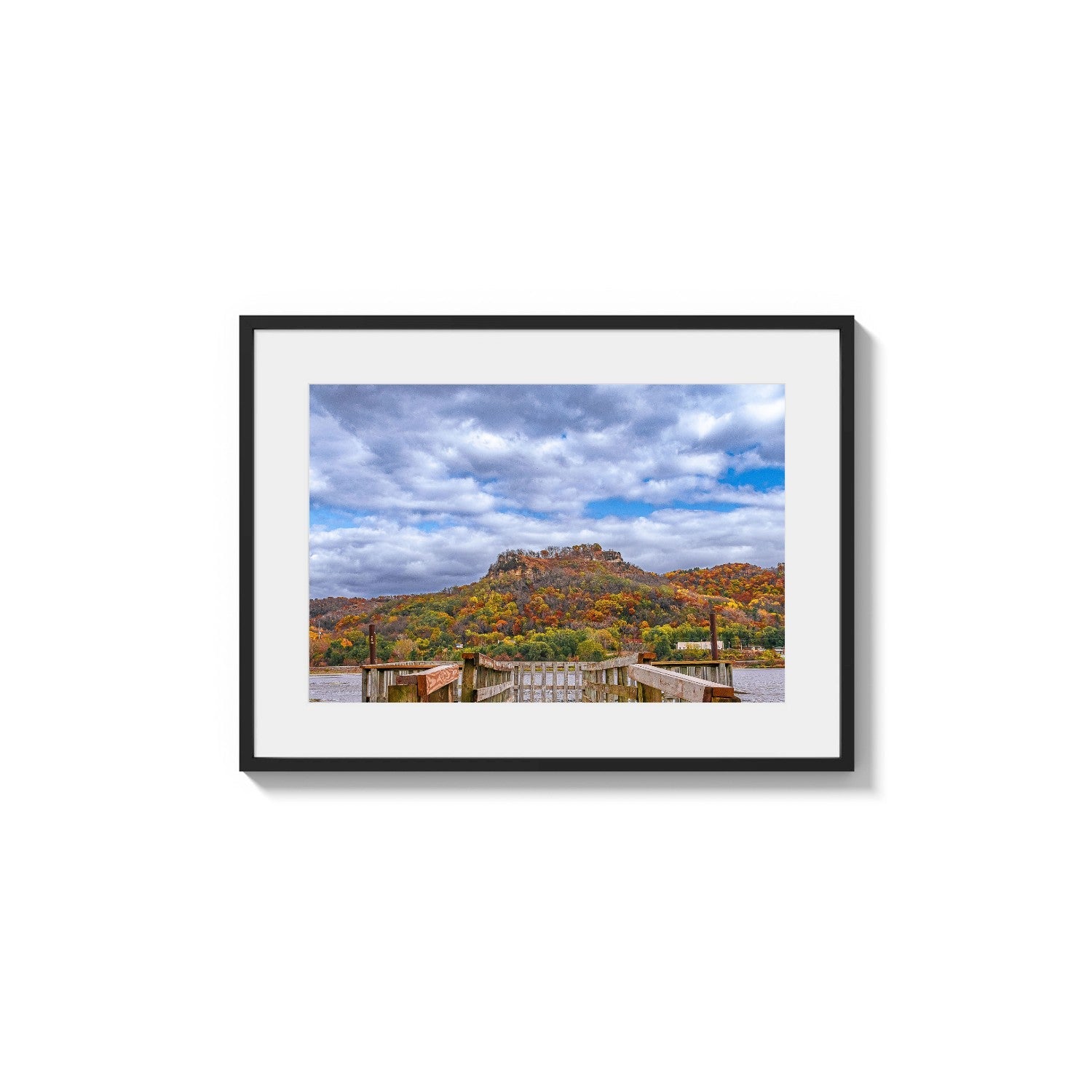 Keywords: terrain formation, changing colors, waterway, photographic art, seasonal transition, moody atmosphere, cumulus, orange foliage, wooden pilings, rusticity, midwestern setting, deciduous, wide expanse, dramatic light, structure