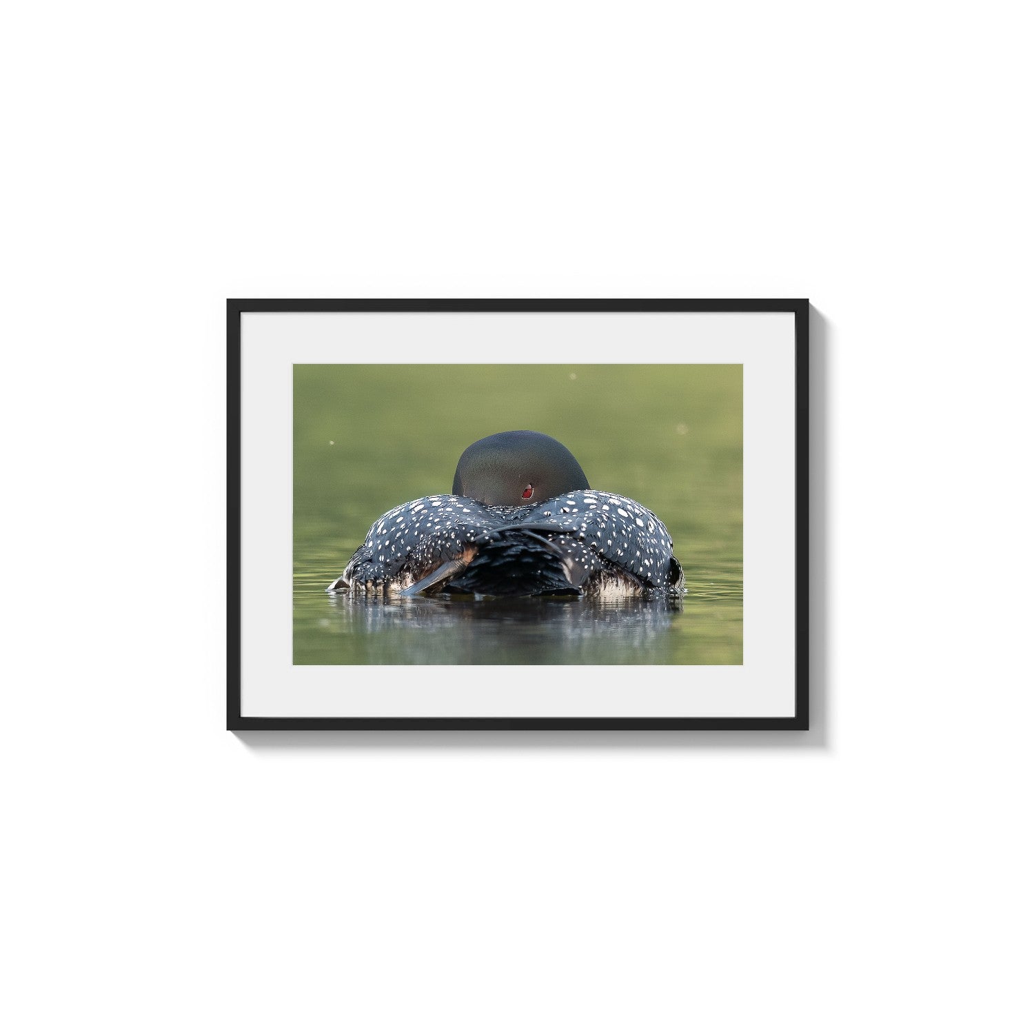 Keywords: wildlife photography, Gavia immer, speckled animal, tranquility, aquatic fauna, slumber, close up, detailed plumage, nature subject, natural habitat, green pond, peaceful animal