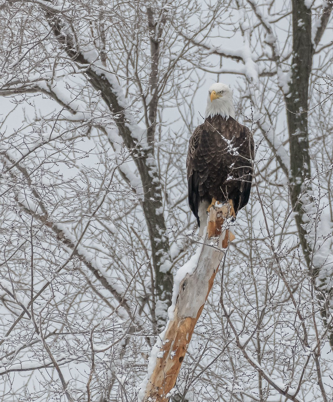 Keywords: Bald eagle, avian, wildlife, nature, photography, bird of prey, deadwood, stump, frost, icy setting, subzero, animal study, contrast, fauna, monochrome effect