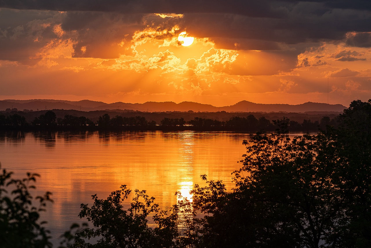 This photographic image captures the intense brilliance of the sun struggling through thick, agitated stratocumulus clouds. Dramatic shafts of gold and deep orange light pierce the sky, reflecting vibrantly on the expansive liquid surface below. The foreground features sharp, deep shadows of vegetation along the banks, providing strong contrast to the bright middle ground. Distant, layered geographical features rest along the far edge under the deeply saturated evening atmosphere.