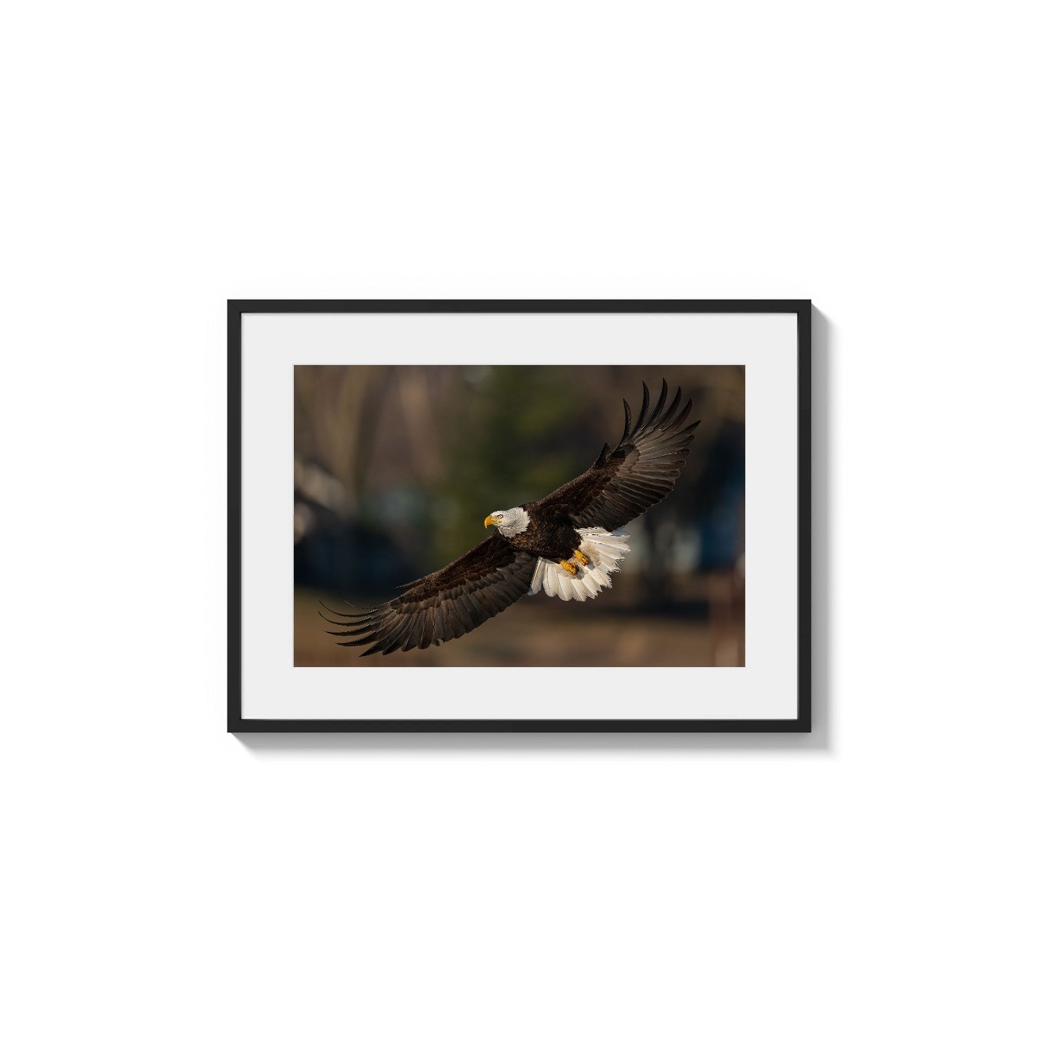 Keywords: Bald Eagle, bird in flight, wildlife photography, raptor, nature photo, majestic, avian, high contrast, dark tones.