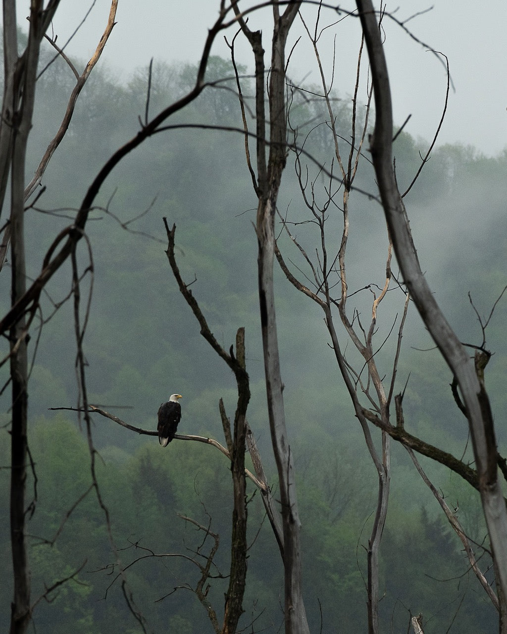 A large bird with an ivory-colored crown sits upon a stark, denuded limb. The setting is shrouded in vapor, creating a diffuse background palette of chartreuse and subdued tones. Silhouetted skeletal limbs frame the central figure, emphasizing its isolated position. The scene evokes a mood of quiet power and remote wilderness.