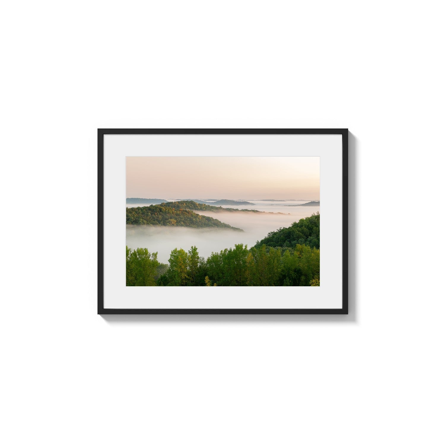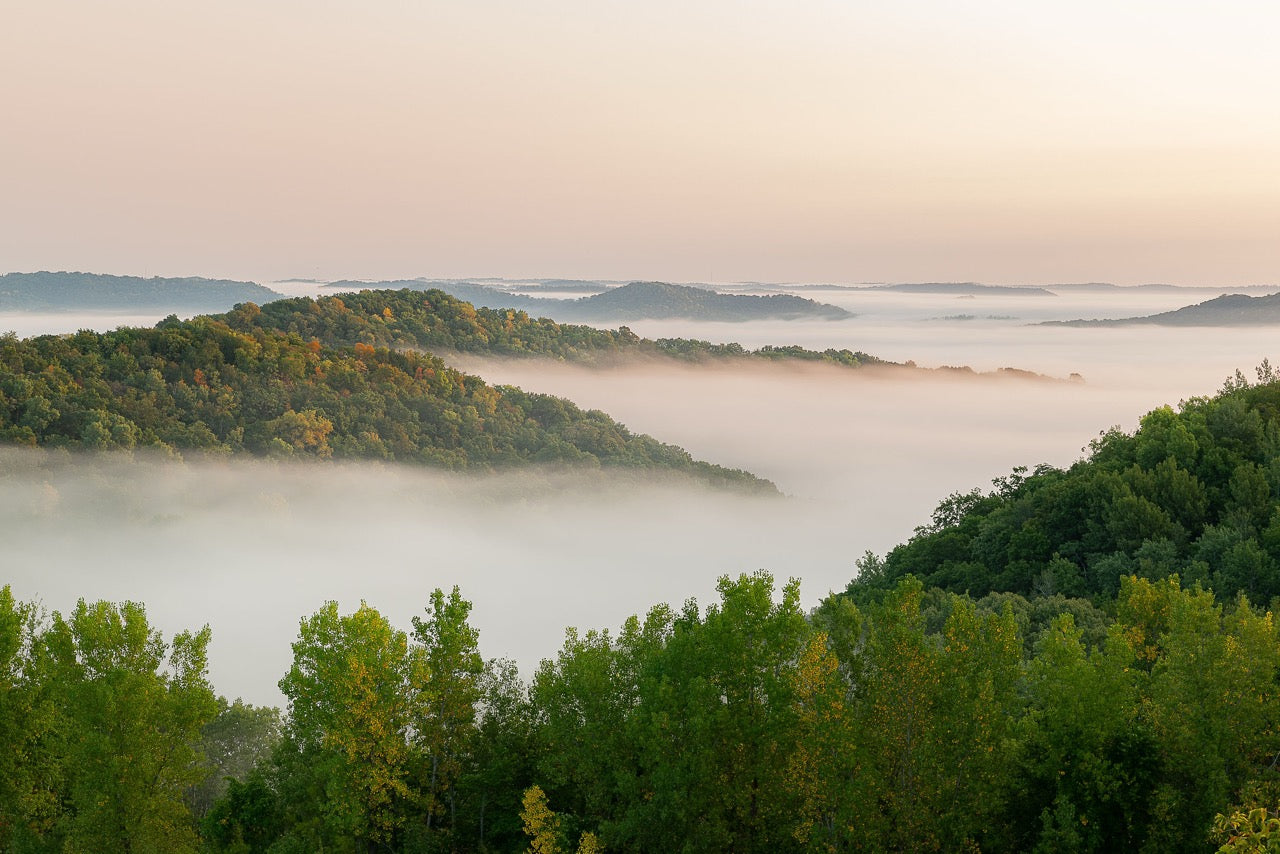 Keywords: Nature photography, hillscape, inversion layer, topography, pastel sky, elevated perspective, soft illumination, chartreuse, deciduous, humid air, ridges, scenic art