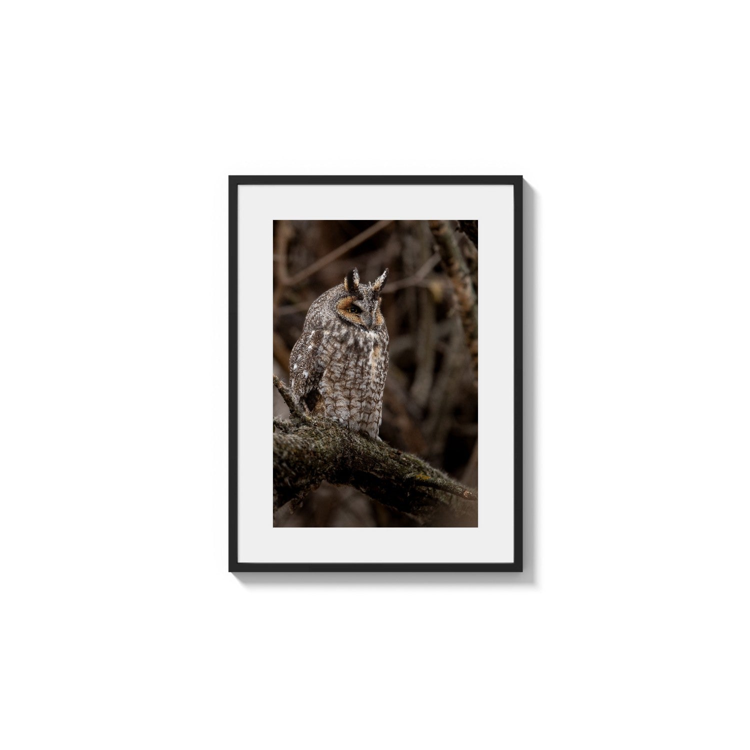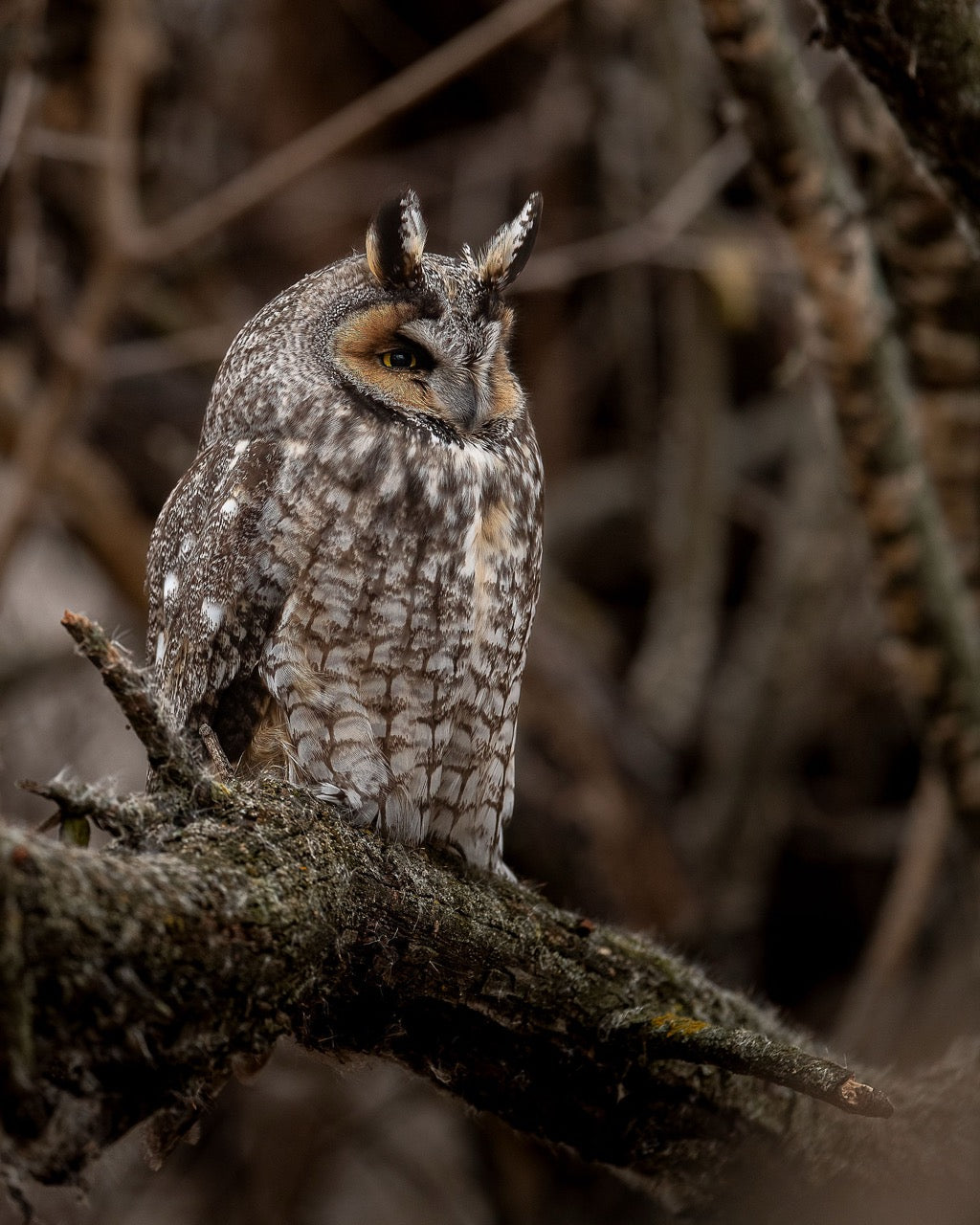 Keywords: Owl, wildlife photography, bird of prey, camouflage, feathered creature, Asio otus, ear tufts, woodland, nocturnal