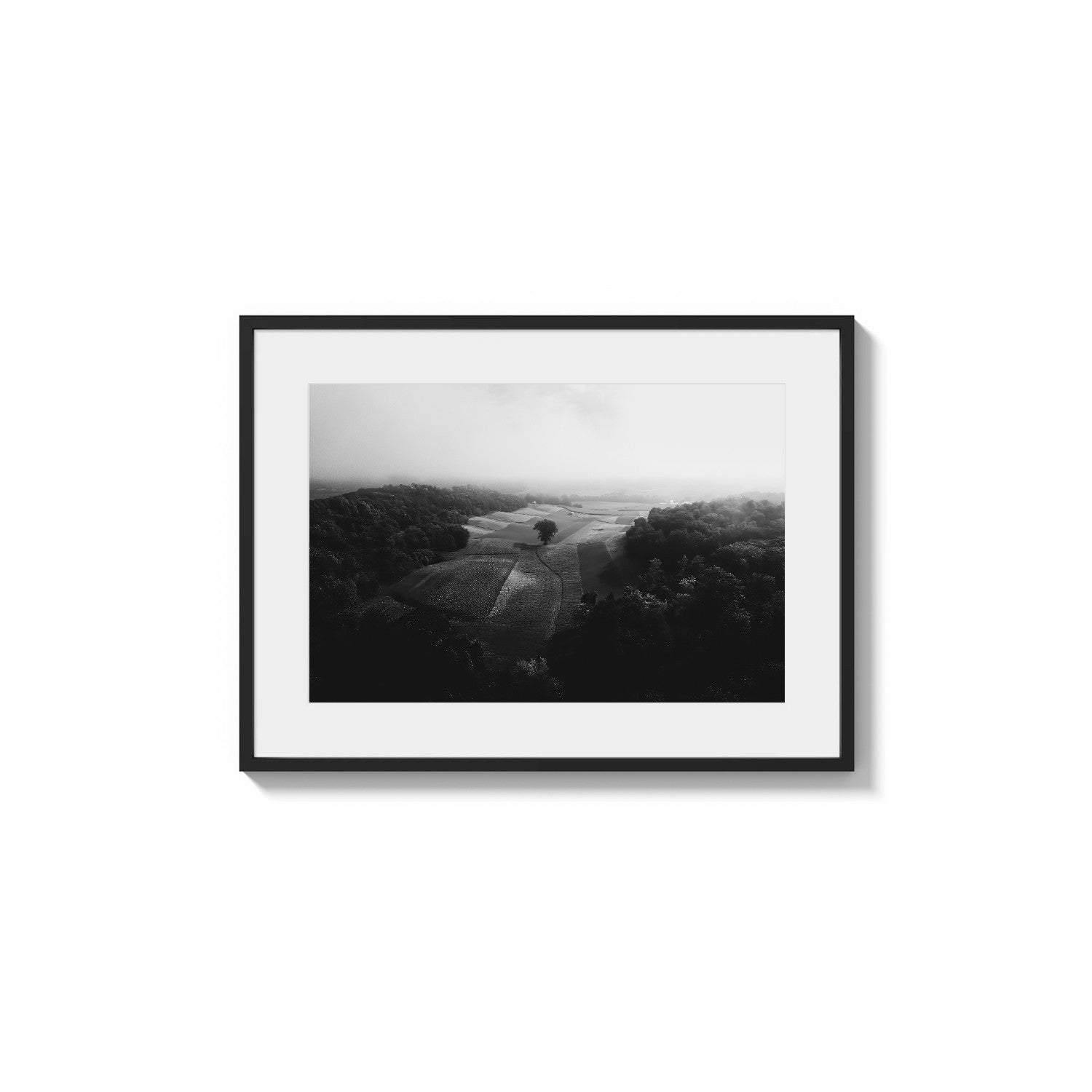 Keywords: Black and white photography, monochrome print, agricultural area, overhead photo, vaporous, textured print, geometric patterns, rural setting, dramatic lighting, cultivation